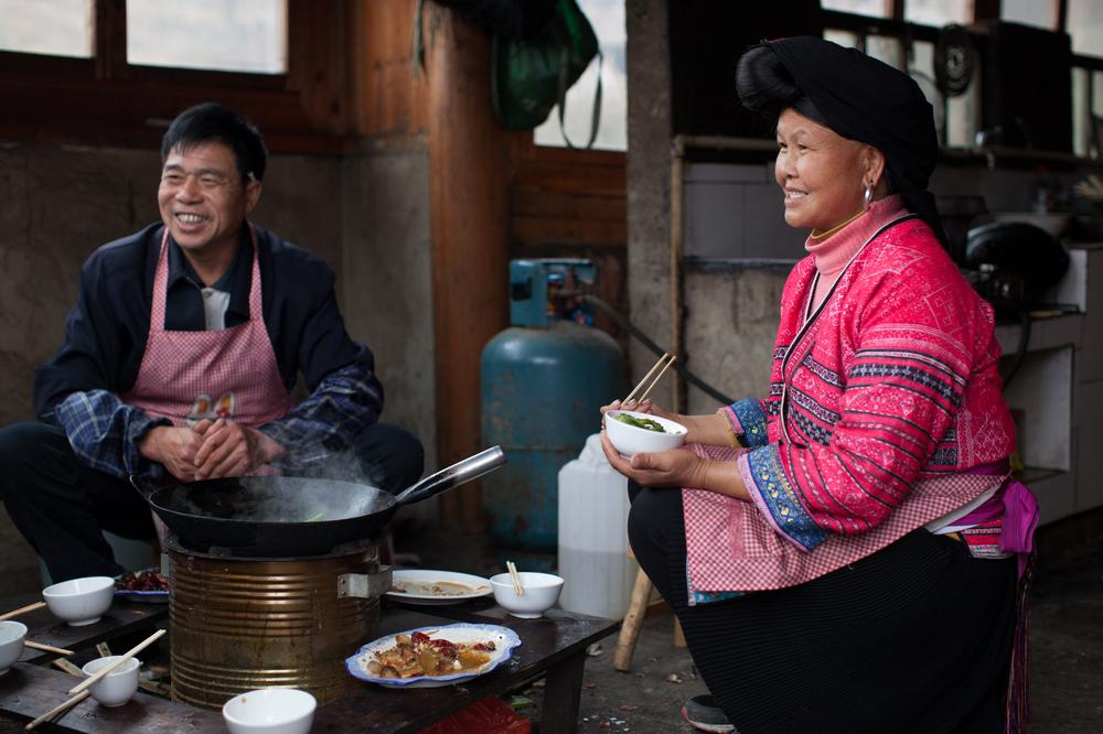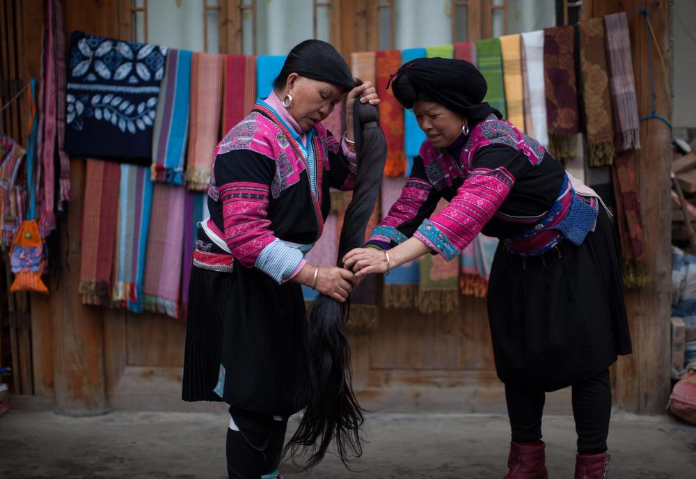 Growing their dark hair long is a tradition here, with some women’s locks almost two metres in length. Yao girls cut their hair only once in their lives between the ages of 16 and 18. It’s difficult to trace the origins of the practice, but women here say long hair is the symbol of long life and prosperity. Unmarried women can’t show their hair in public, so they cover their heads with a black turban.