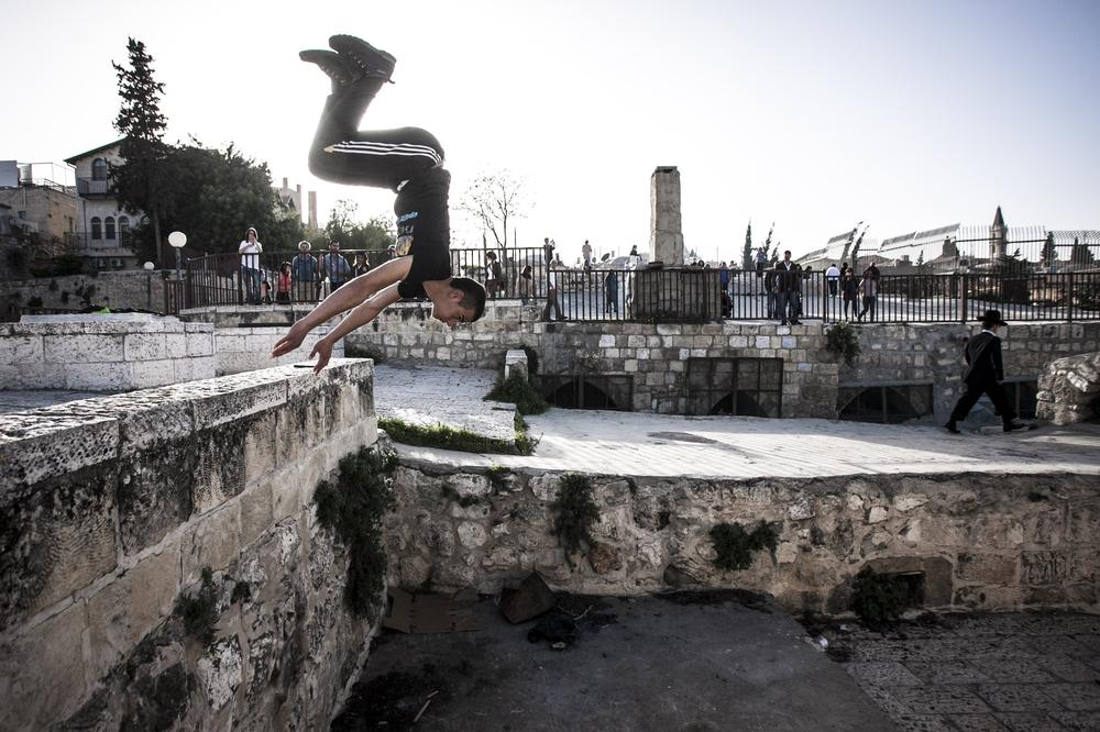 Jerusalem – Walking down the narrow streets of the Old City of Jerusalem, silhouettes of young men fly over market stalls in the souk. These daredevils are Palestinians practicing parkour, the death-defying sport combining gymnastics, acrobatics, running and jumping.