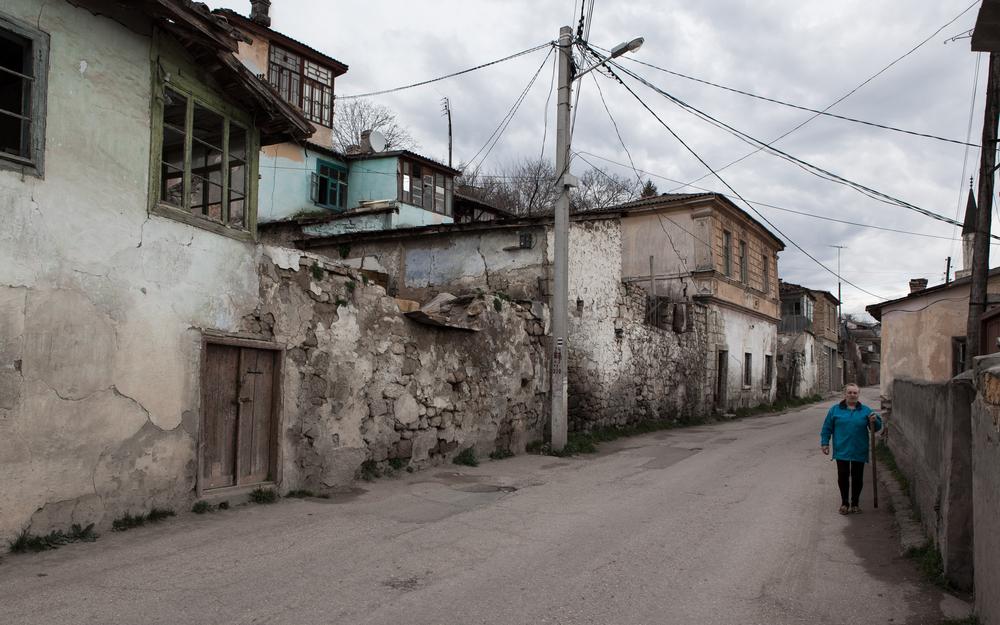 A woman walks down a narrow street in Bakhchisaray, where ethnic Russians, Ukrainians and Tatars have co-existed peacefully for decades.