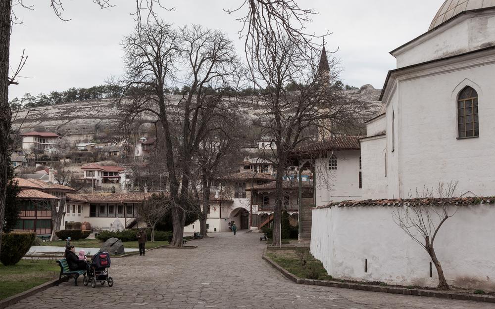 A handful of people walk around inside the Bakhchisaray Palace, built in the 16th century and once home to the Tatar rulers. A popular tourist destination, locals fear that this year few people are going to come and visit.
