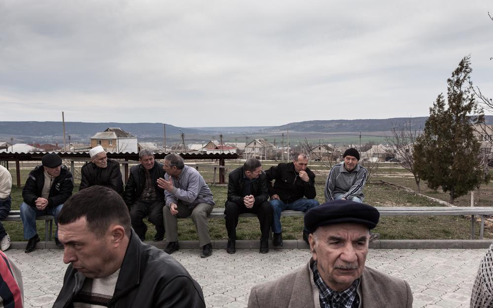 Crimean Tatars gather outside a mosque in Bakhchisaray, where tensions and uncertainty are on the rise.