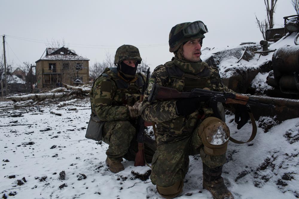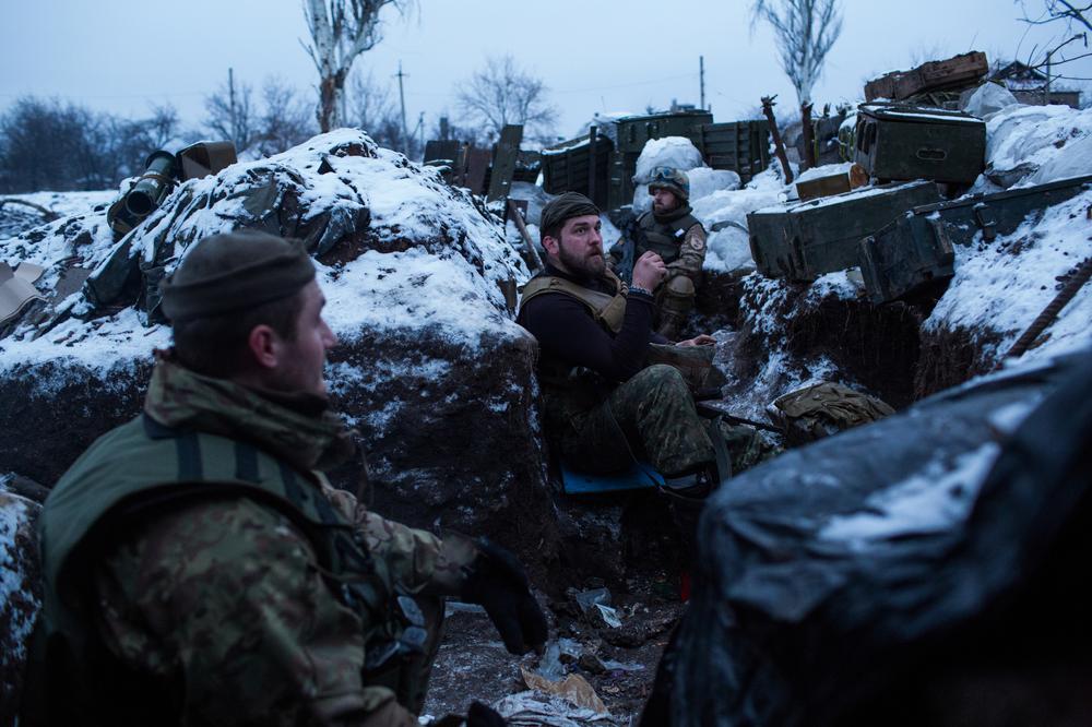 Pisky village, Ukraine – Rifle rounds zip over the helmeted heads of the volunteers of the Sich Battalion in the last trench before Donetsk.