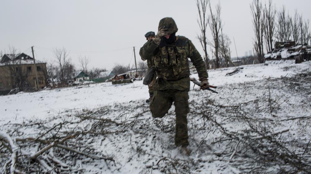 Volunteers from the Ukrainian Dnipro-1 Battalion run back after moving forward to get a better view of rebel positions. The town has been the scene of fierce fighting for months.