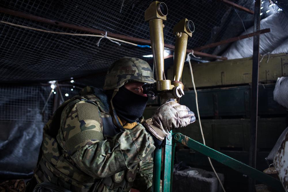 A volunteer from the Ukrainian Dnipro-1 Battalion in a forward position peers through a trench periscope at rebel positions down the main road through Pisky towards Donetsk.