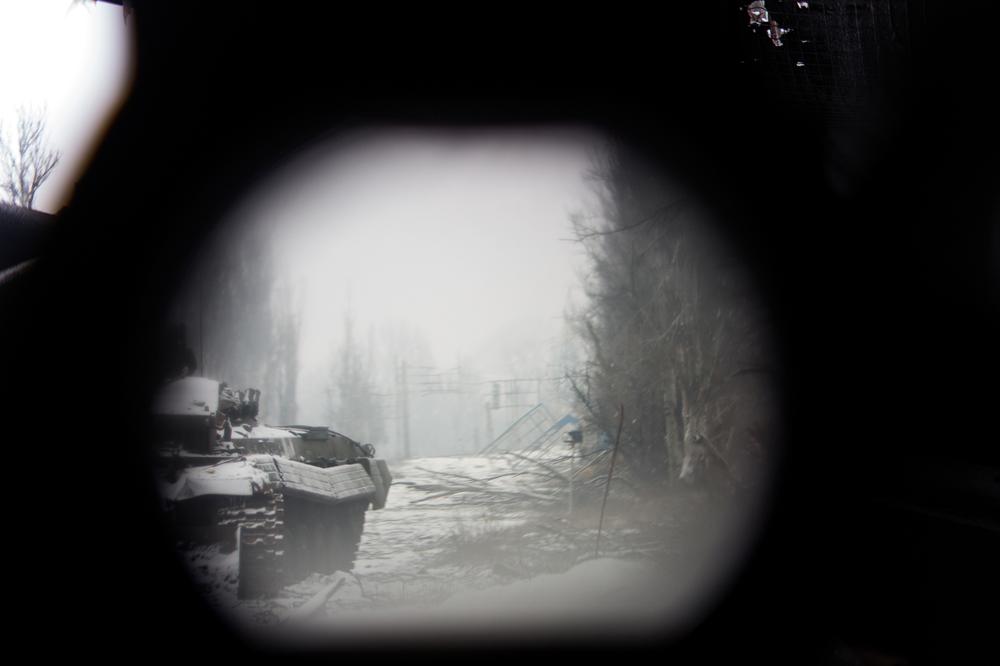 An armored personnel carrier disabled on Mirny Prospekt - Peace Street - the main road into Donetsk, is visible through a trench periscope at a Ukrainian forward position.
