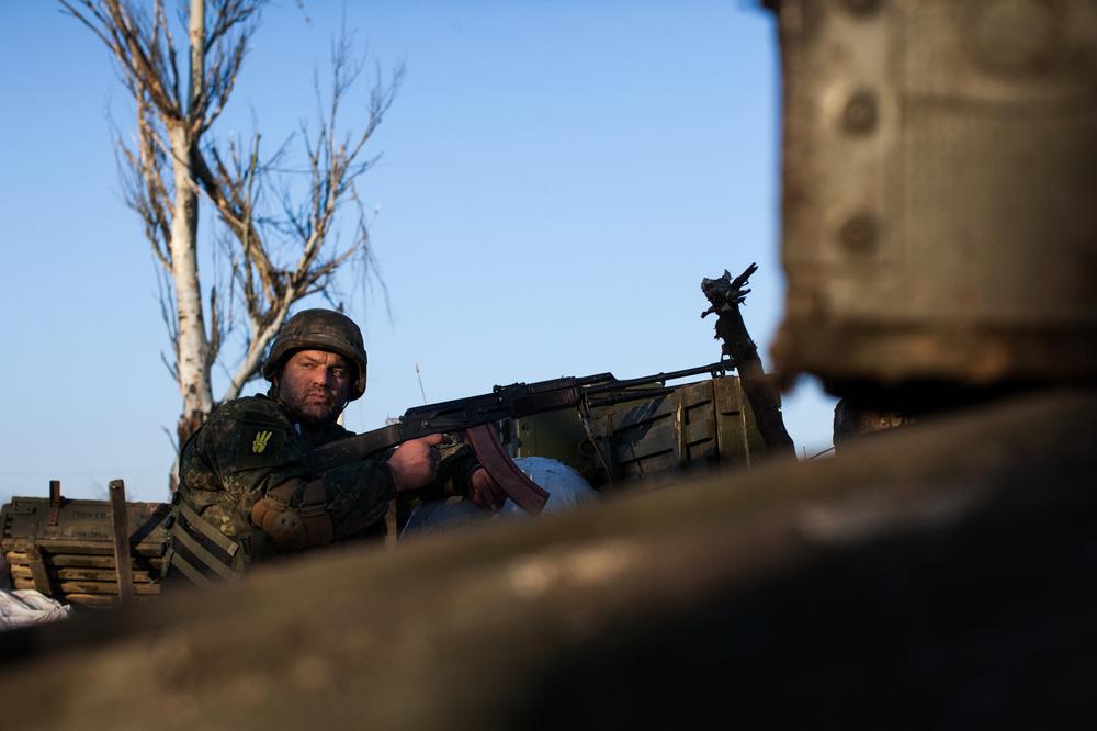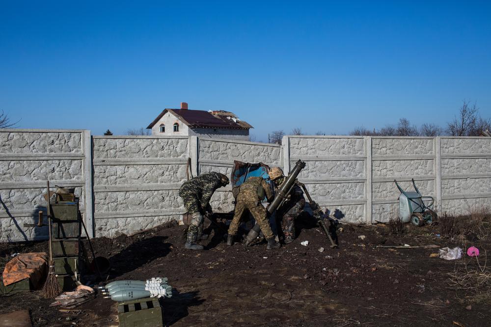 A volunteer from the Ukrainian Sich Battalion fires blindly from the last trench before no-man's-land on the front line in Pisky, just outside of Donetsk.