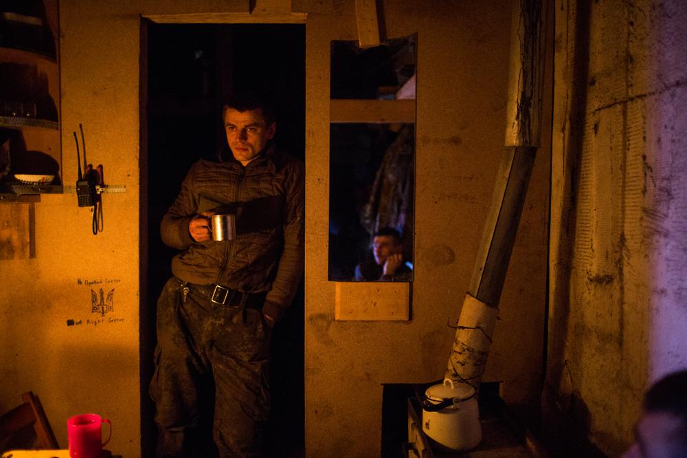 A member of a pro-Ukrainian Pravy Sektor platoon holed up in the elevator control room of an old coal mine, warms up with a cup of tea in a candle lit bunker.