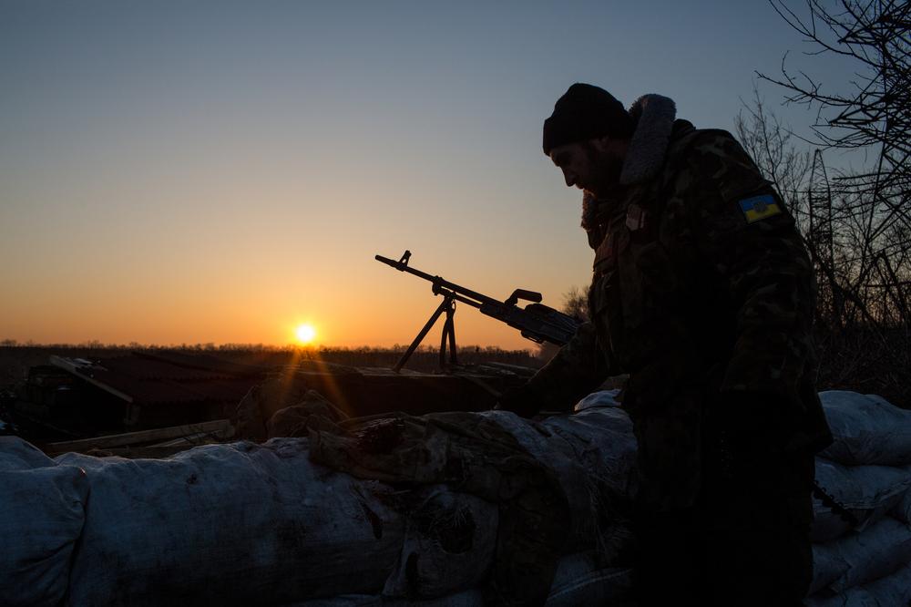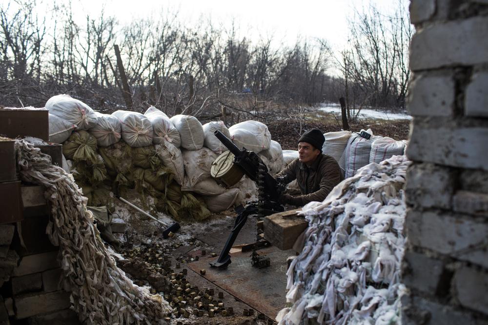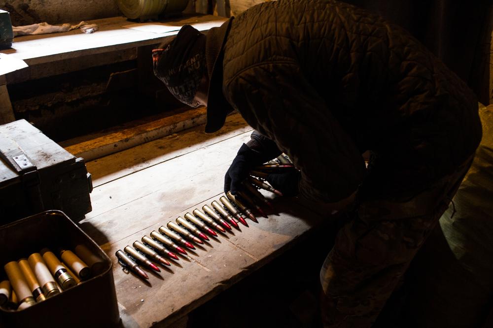 A member of a volunteer battalion prepares a belt of ammunition for his machine gun outside of his bunker on the edge of Pisky. Beyond, a field of unharvested sunflowers rots in the winter light.