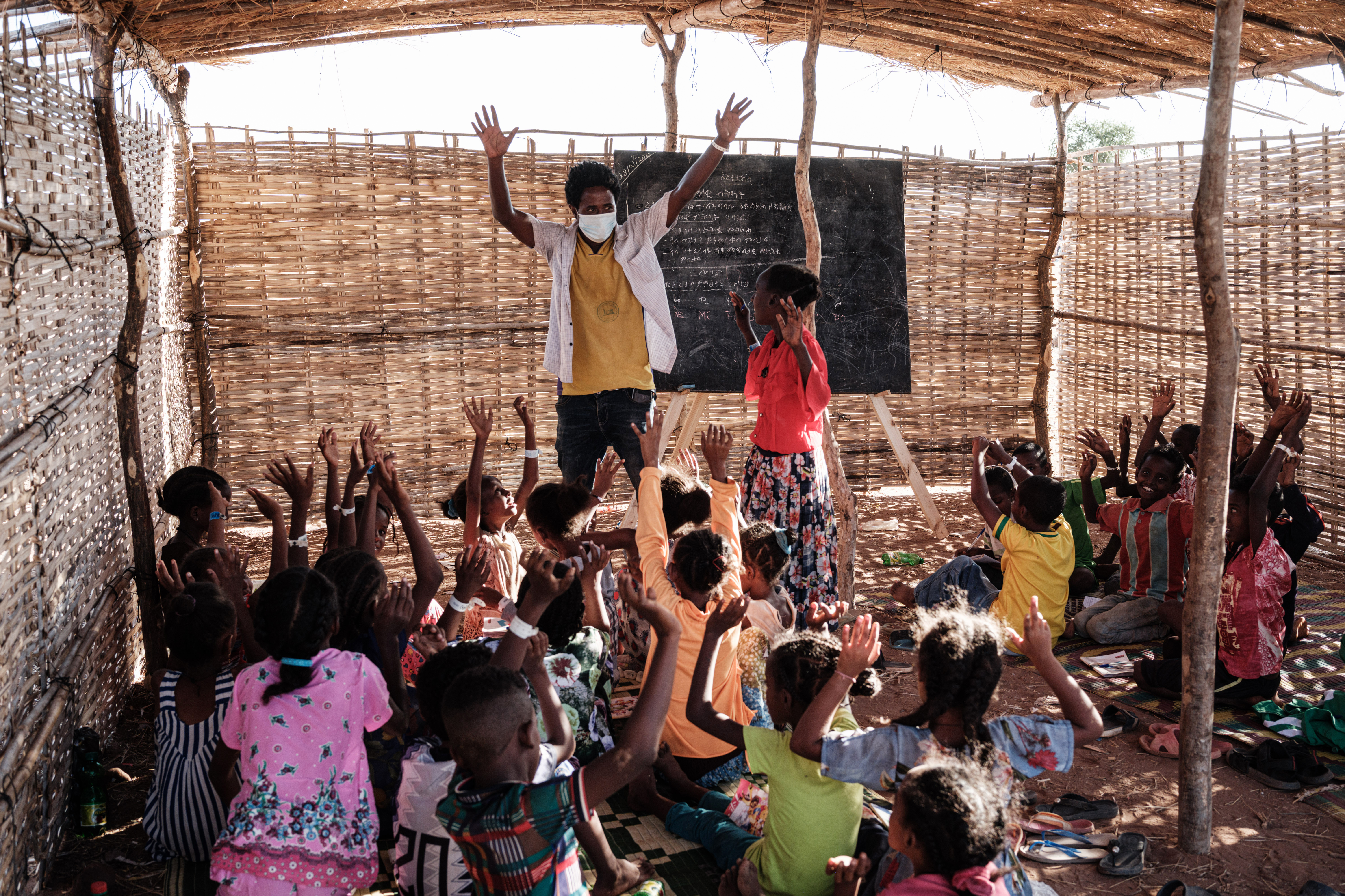 Shielded from the hot mid-afternoon sun in a makeshift classroom built from wood and straw, the children sing back in unison.