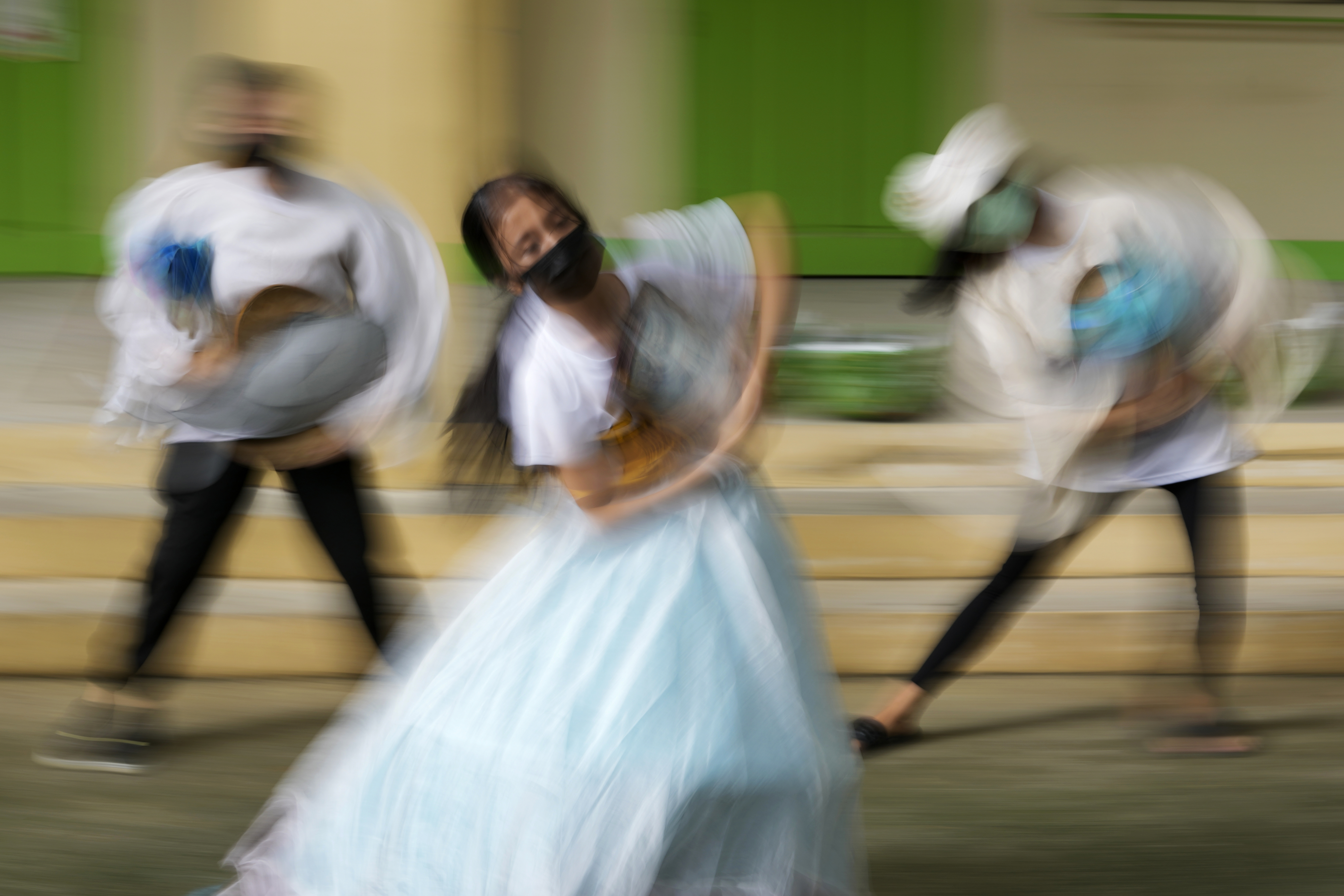 In Taytay, the Philippines, members of the INDAK Banak dance company wear masks to prepare for an upcoming competition. Abegail Mesa is overwhelmed – finally, she can dance with her friends.