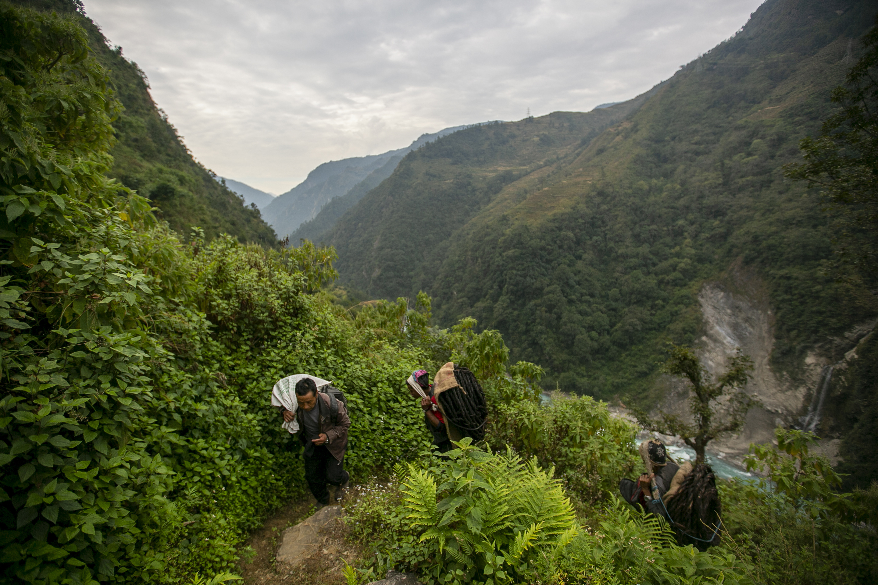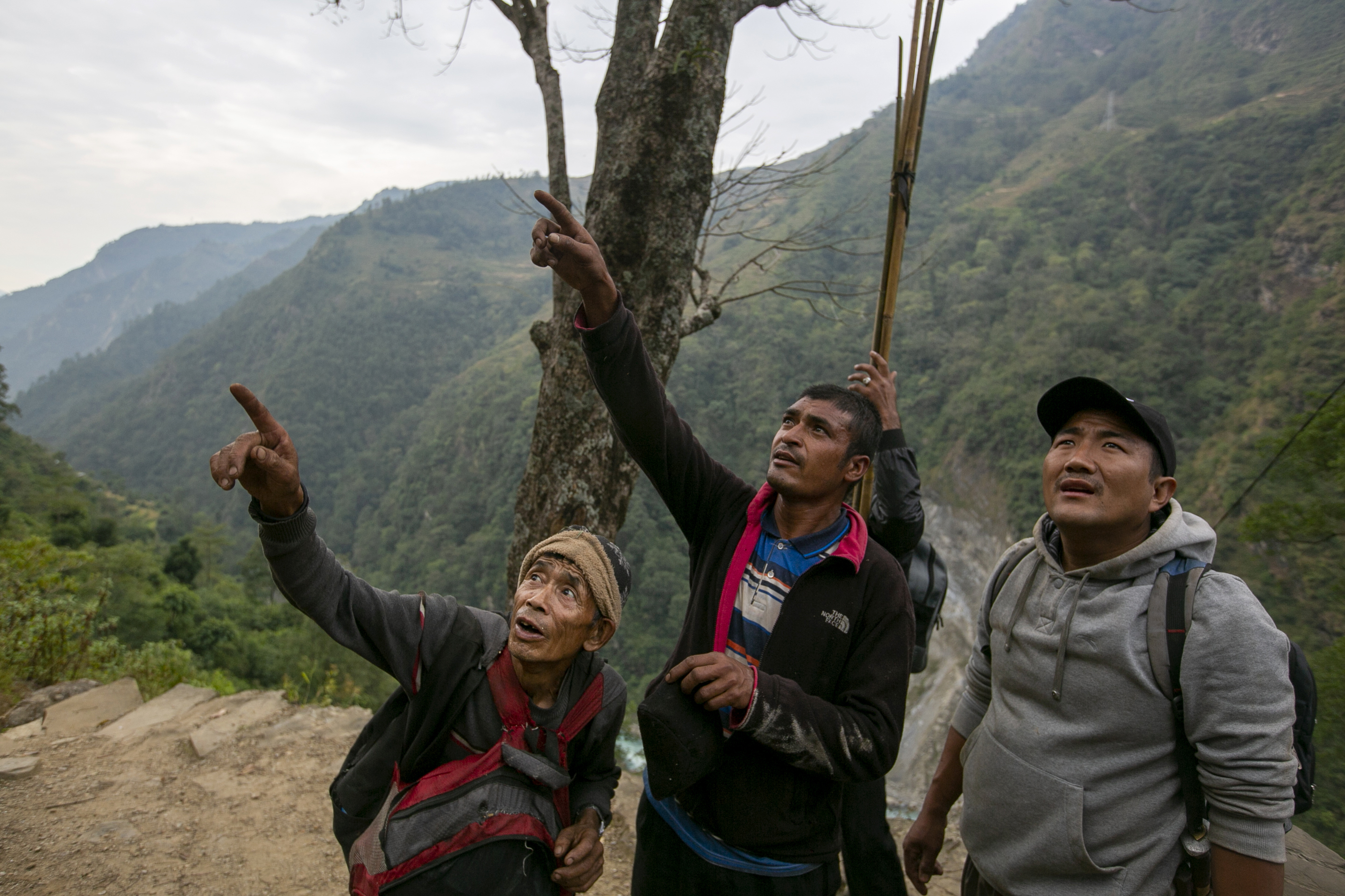 Trekking hours through the steep mountains, one group led by experienced honey hunter Devi Bahadur Napali carried food, bamboo ropes, sharp bamboo sticks and other tools needed to harvest the honey.