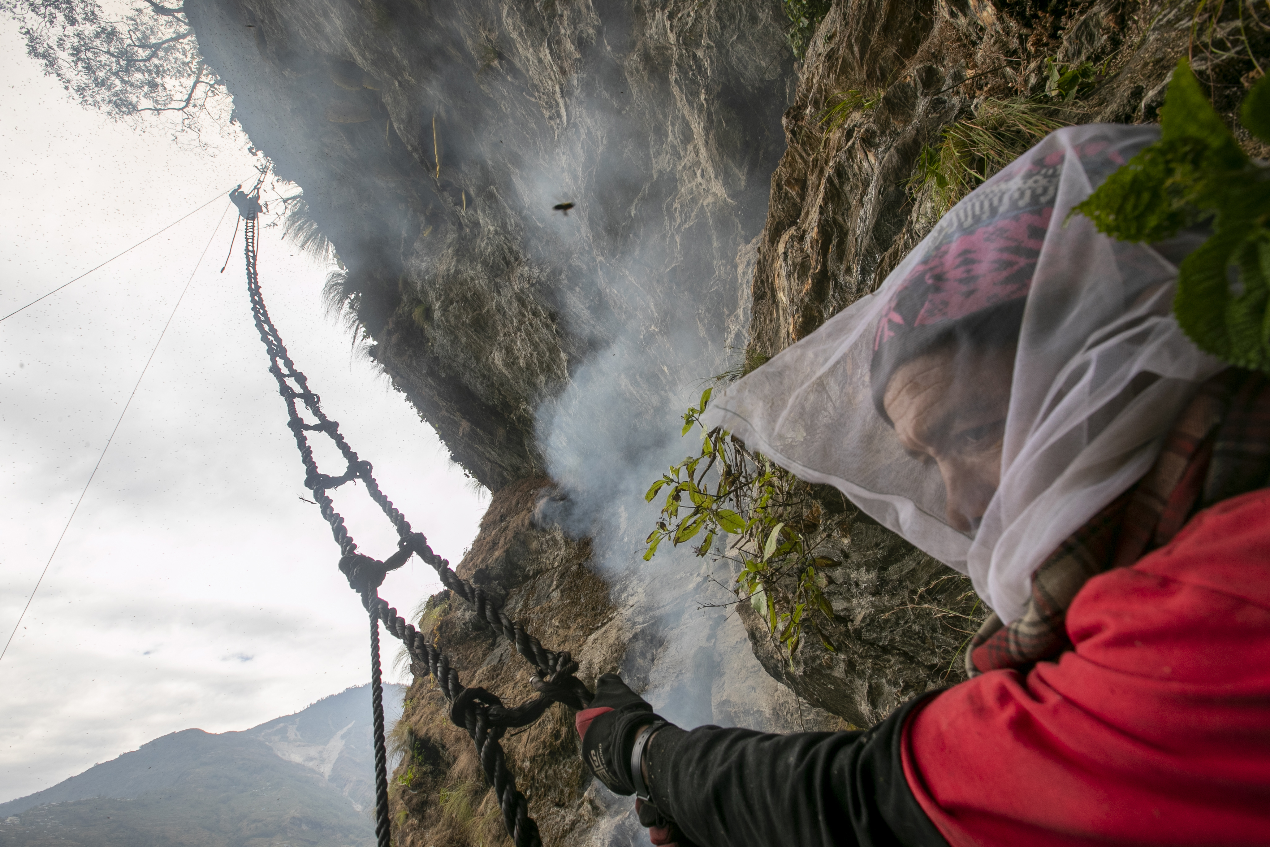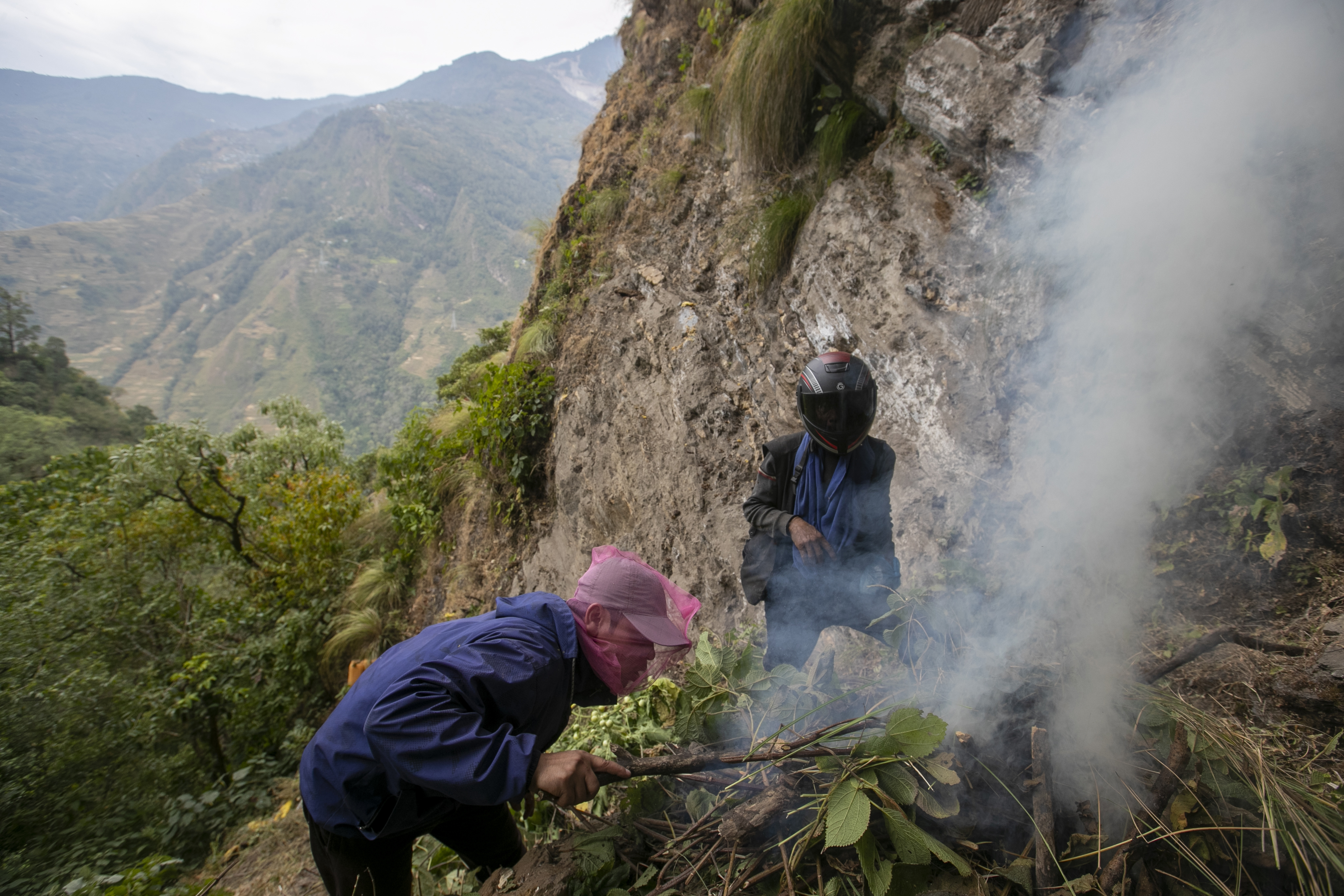 Before starting to climb a steep cliff high above the Tama Koshi River, Nepali reminded the group to ensure they had enough food, water and local alcohol. They piled up grass and logs at the bottom of the cliff and lit a fire to smoke the bees out of their hives.