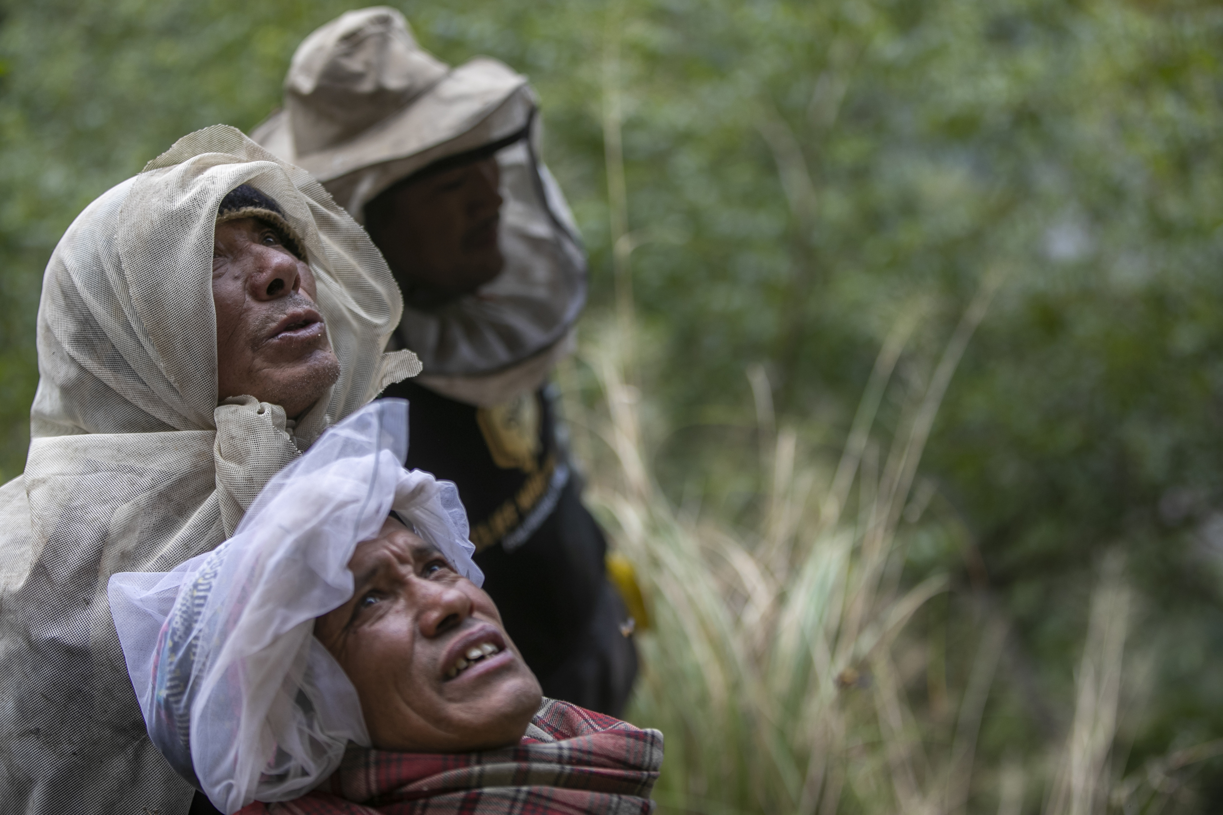 Thousands of bees hovered over the men’s faces, which were protected by face nets.