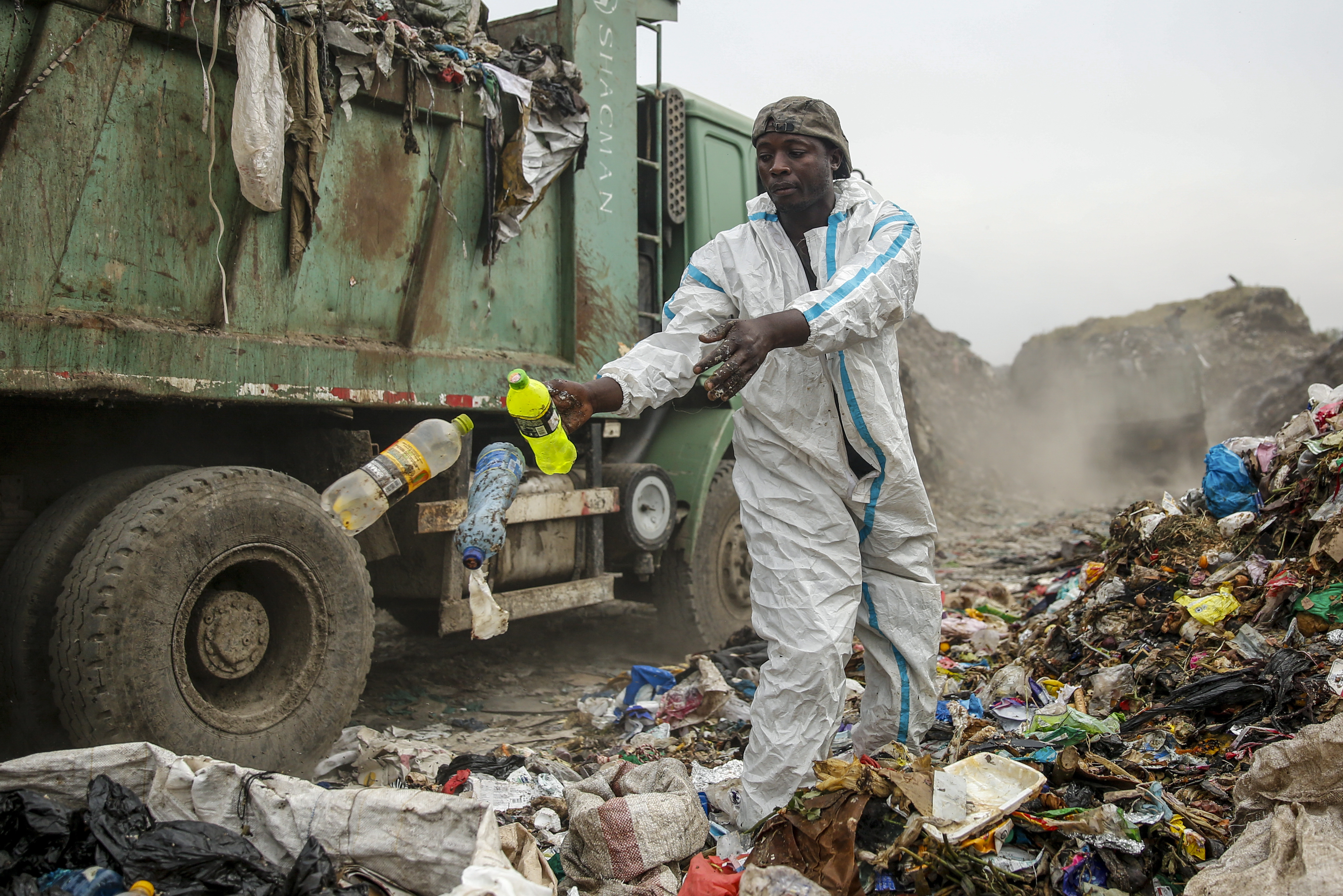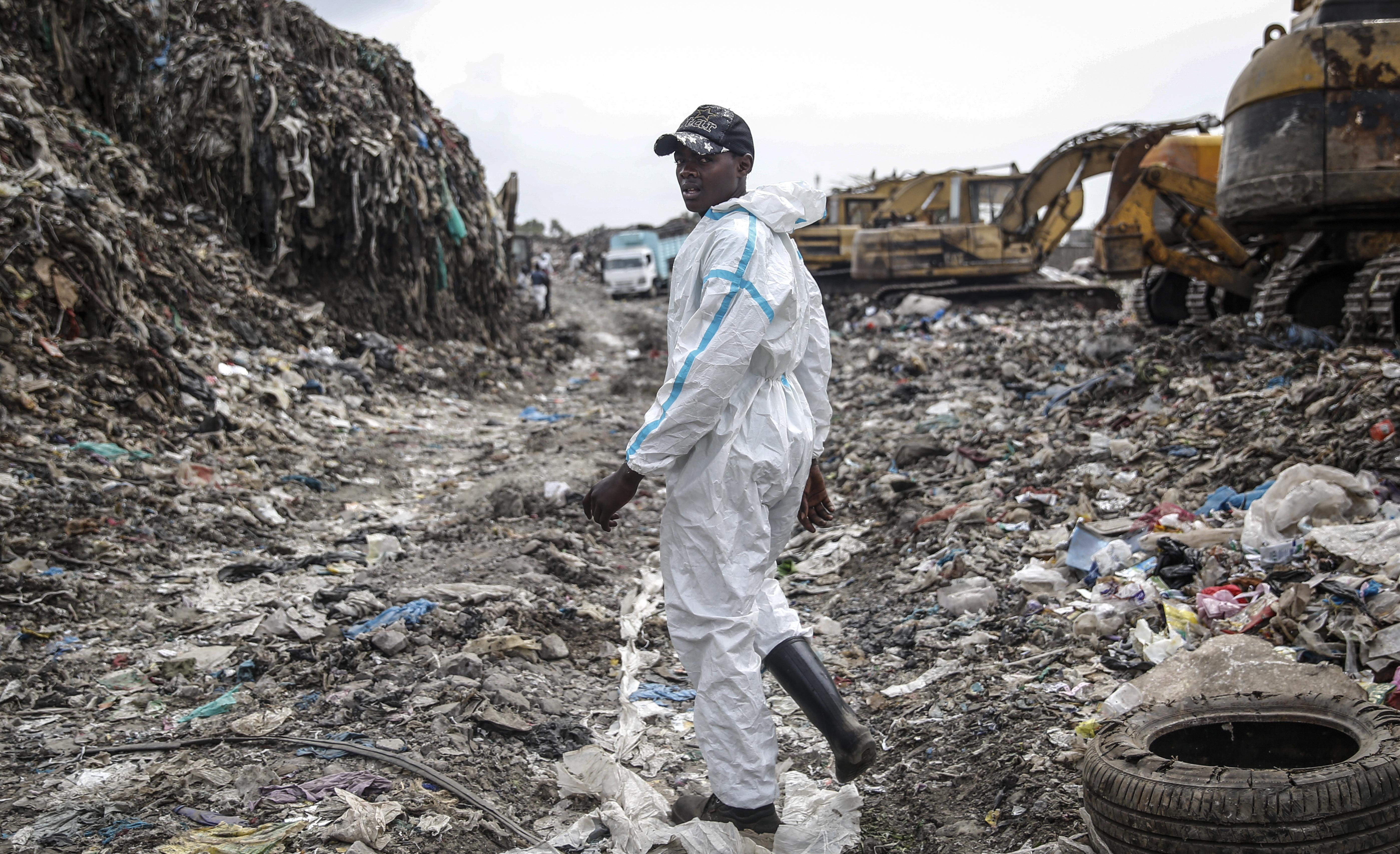 At the Dandora landfill in Kenya’s capital of Nairobi, some of the scavengers who are not eligible for a shot don medical gear discarded by hospitals and health clinics, saying it especially protects them from the weather during the rainy season.