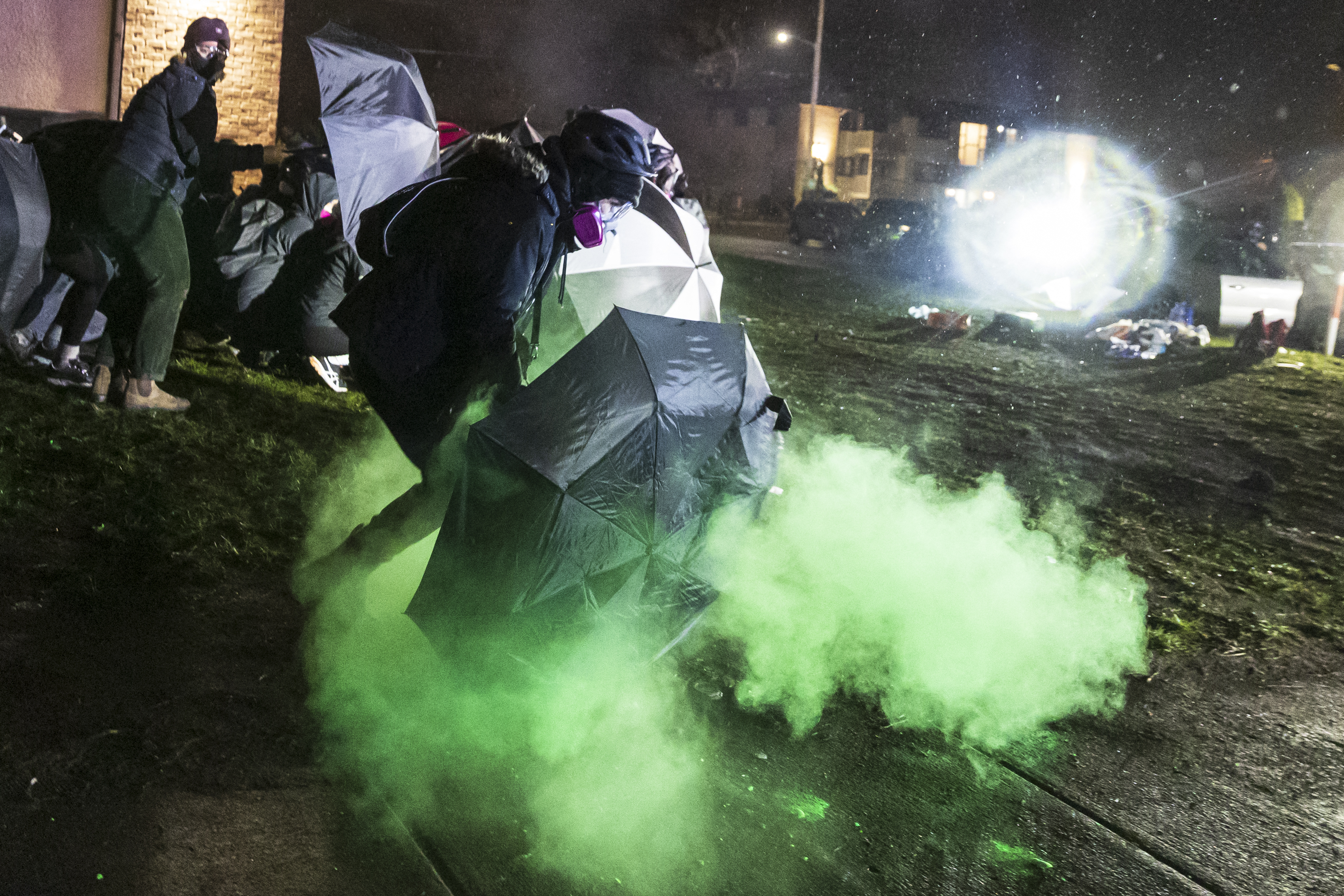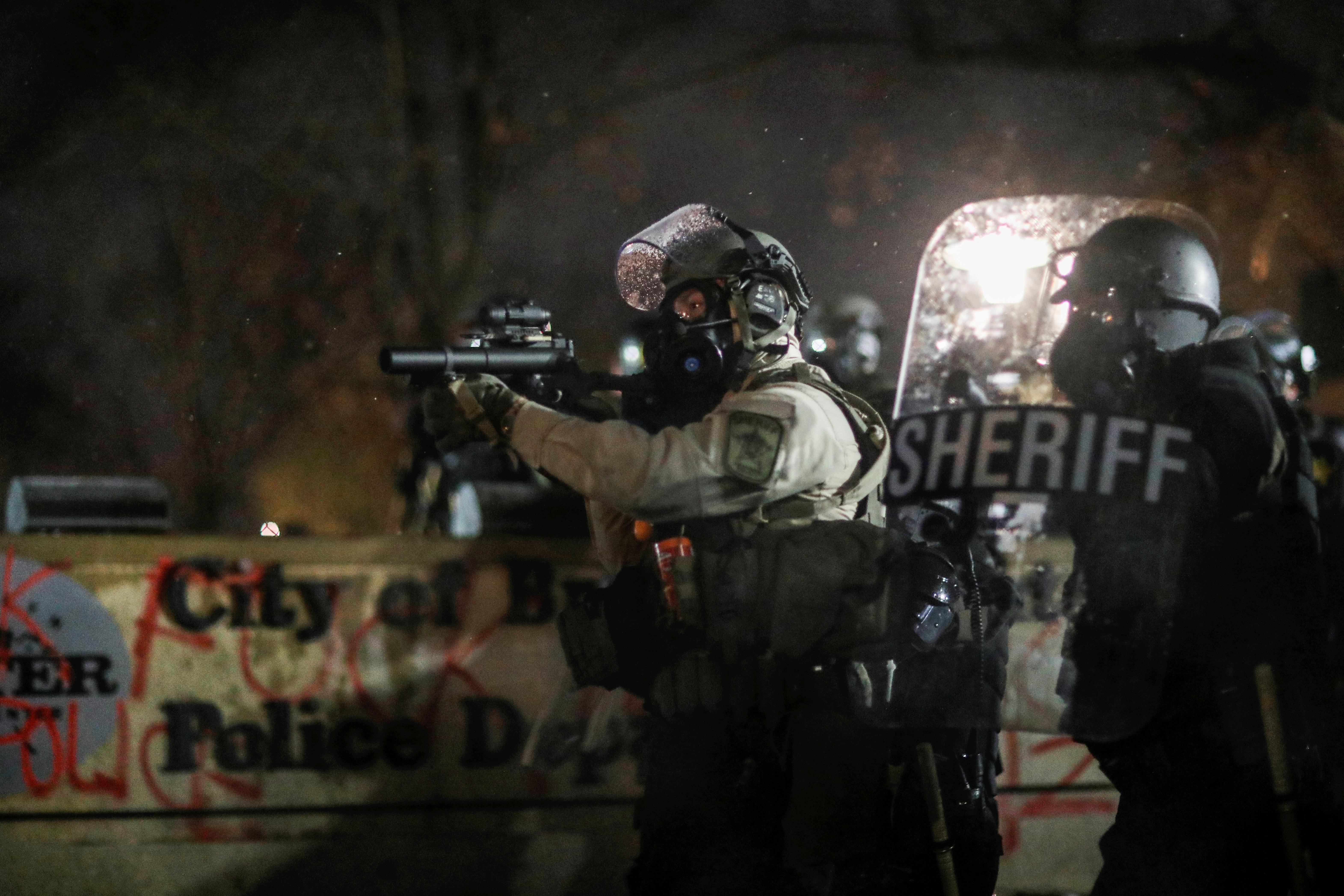 Police in the Minneapolis suburb of Brooklyn tried to chase the crowd away but some protesters picked up smoke canisters and threw them back towards police as others shot fireworks towards the patrolling officers.