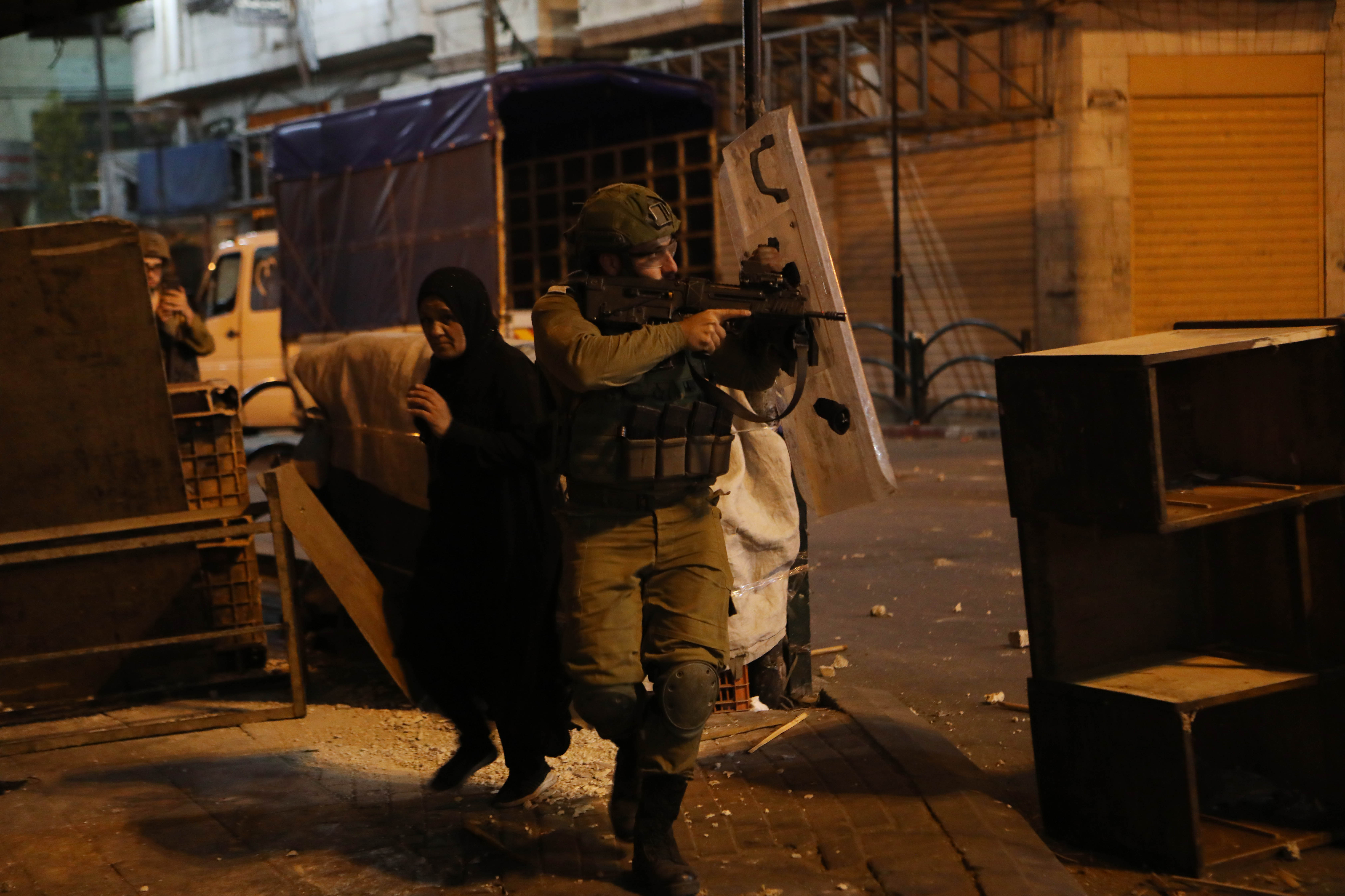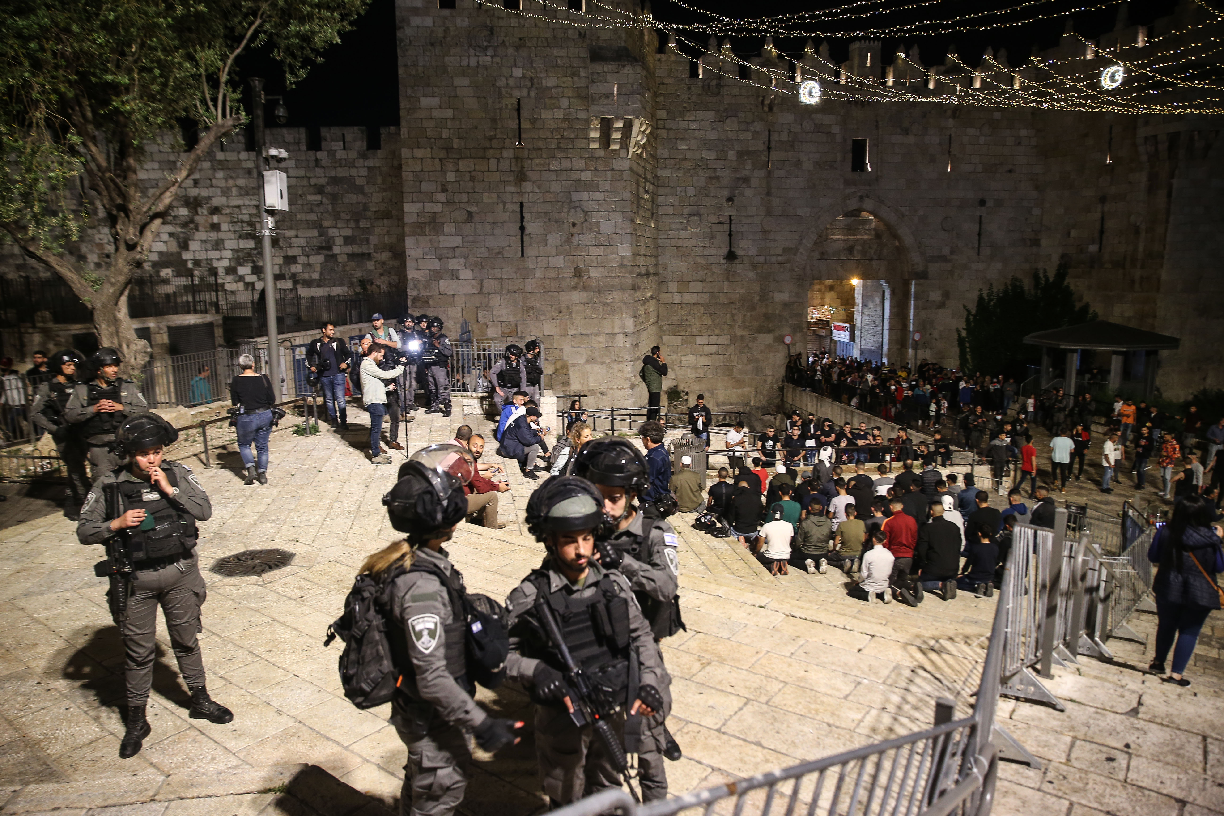Hundreds of police officers in riot gear deployed around the Old City after nightly clashes spilled into the Gaza Strip and occupied West Bank. Some Palestinians threw stones and bottles as police on horseback dispersed the crowds, though the violence appeared less intense than on previous nights.