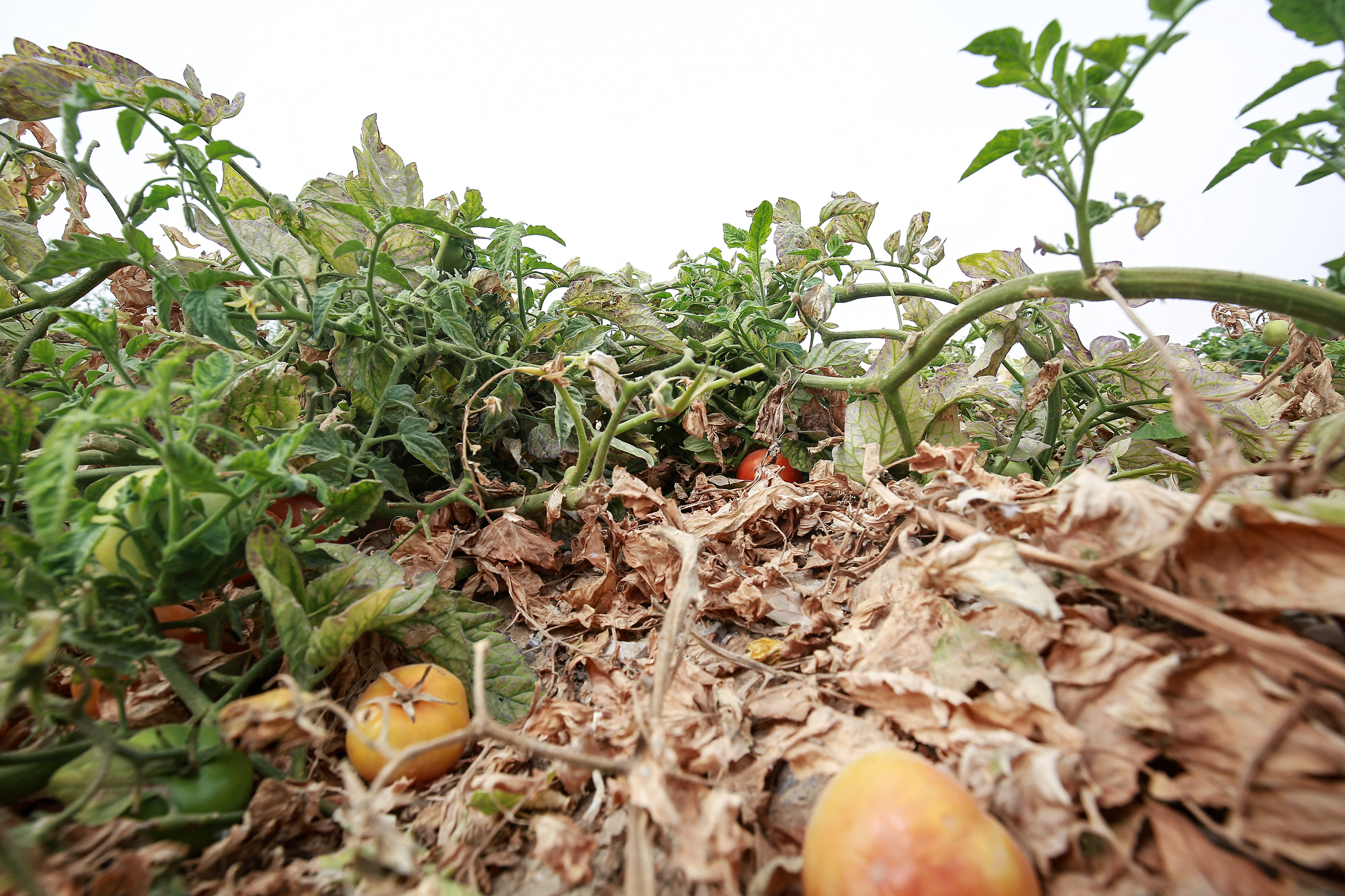He inspected a tomato the size of a marble that had dried up before it ripened.