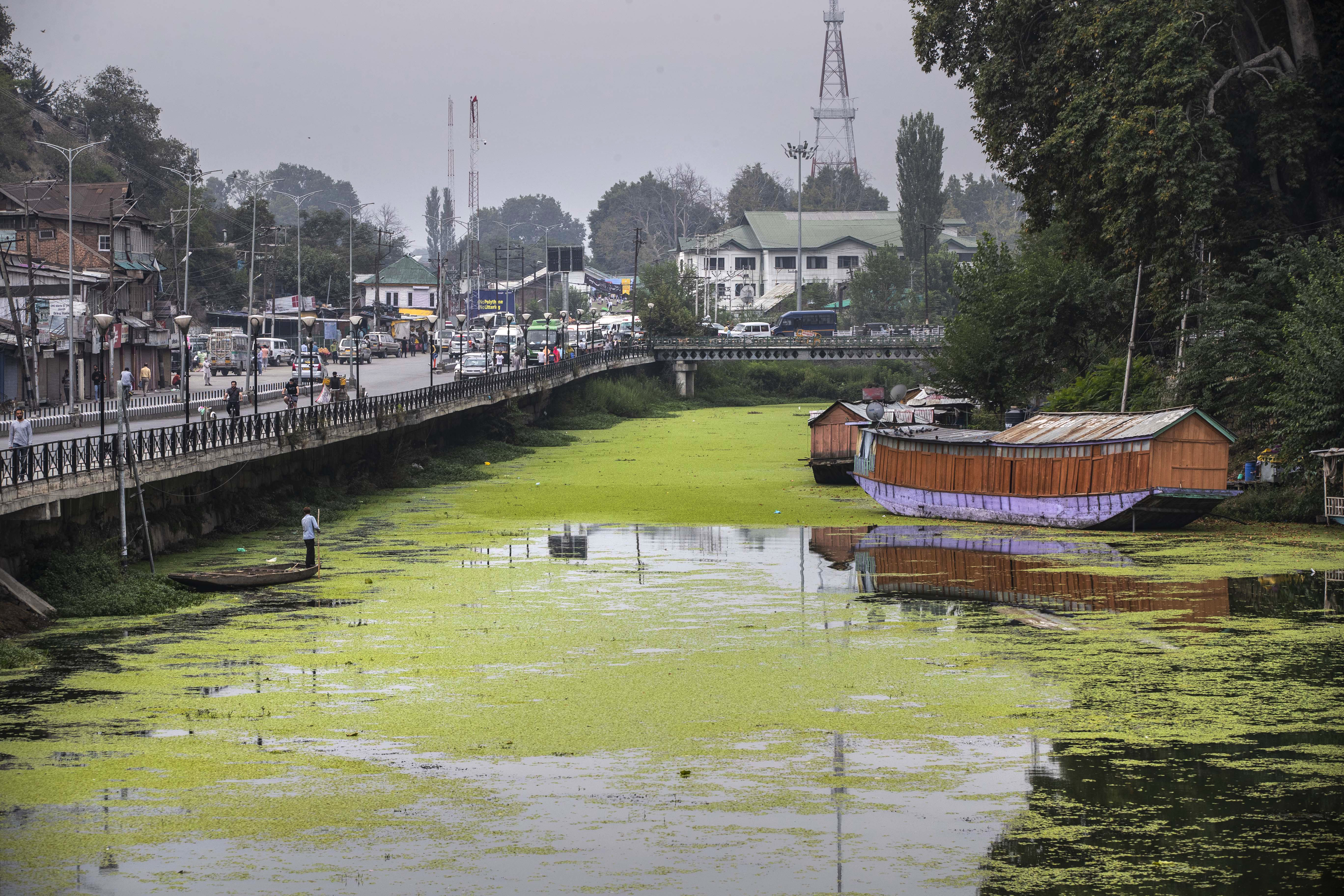 Boatman Noor Muhammad struggles to row as his boat moves deep into the famed Dal Lake in Srinagar, the main city in Indian-administered Kashmir. He presses hard on his oar to untangle the vessel from thick vegetation.