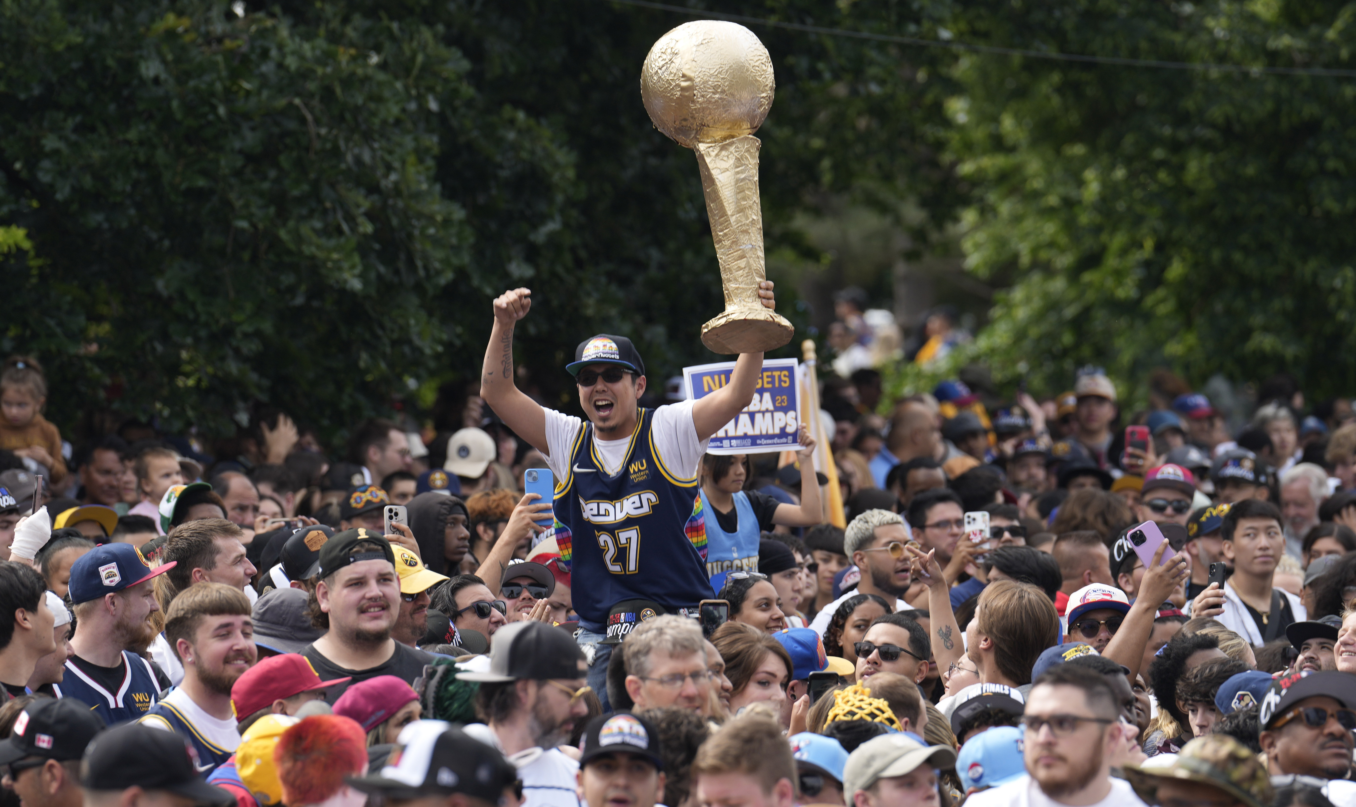 With cigars being lit and champagne and beer flowing, players waved to supporters. NBA Finals Most Valuable Player Nikola Jokic and teammate Jamal Murray rode in a fire truck retractable ladder bucket as the crowd cheered block after block.