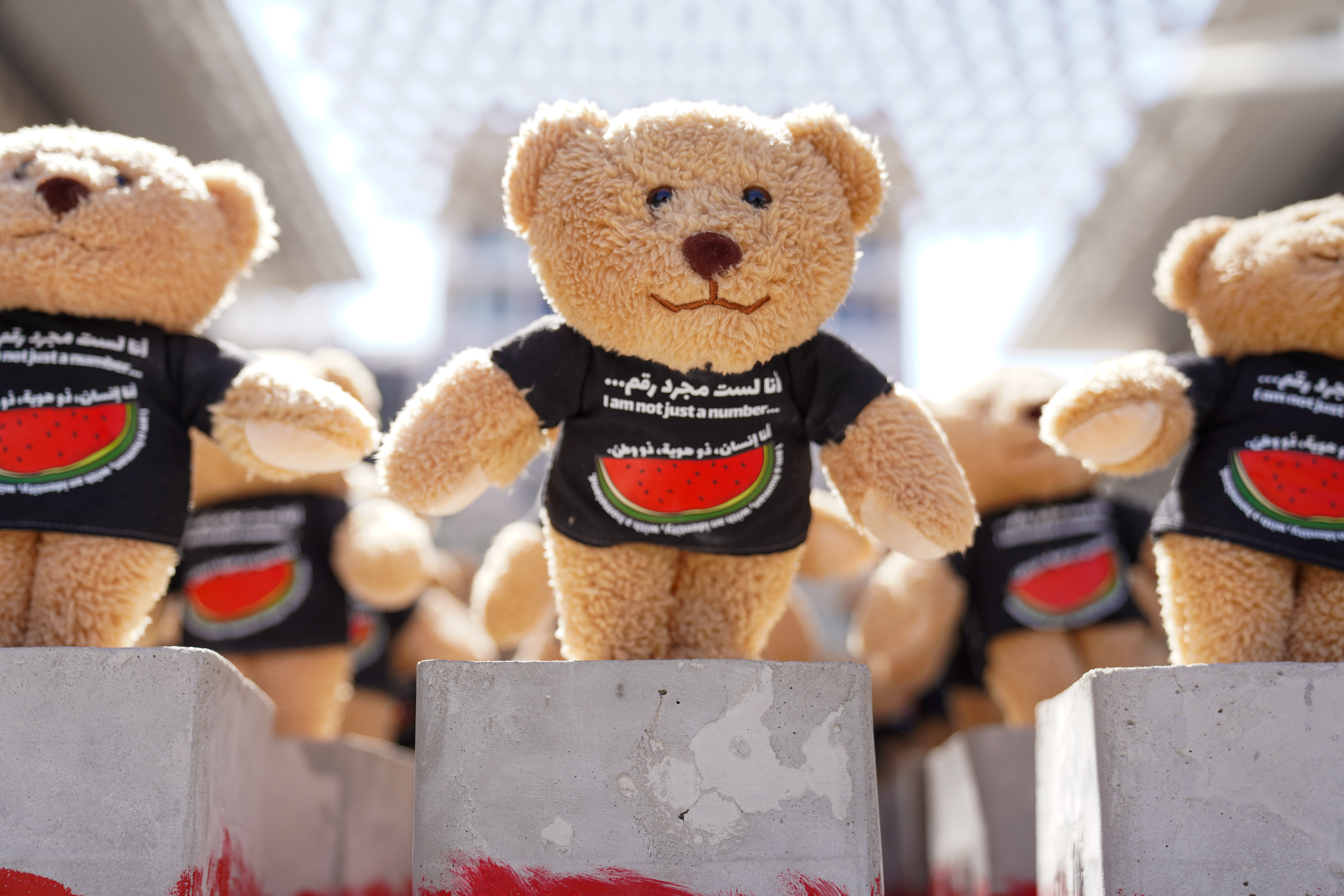 The teddy bears dressed in black t-shirts emblazoned with the message “I’m not just a number. I’m human. With an identity. With a homeland. I am Palestine. #Free Palestine” line up the pavement at Barahat Msheireb in Msheireb Downtown Doha.