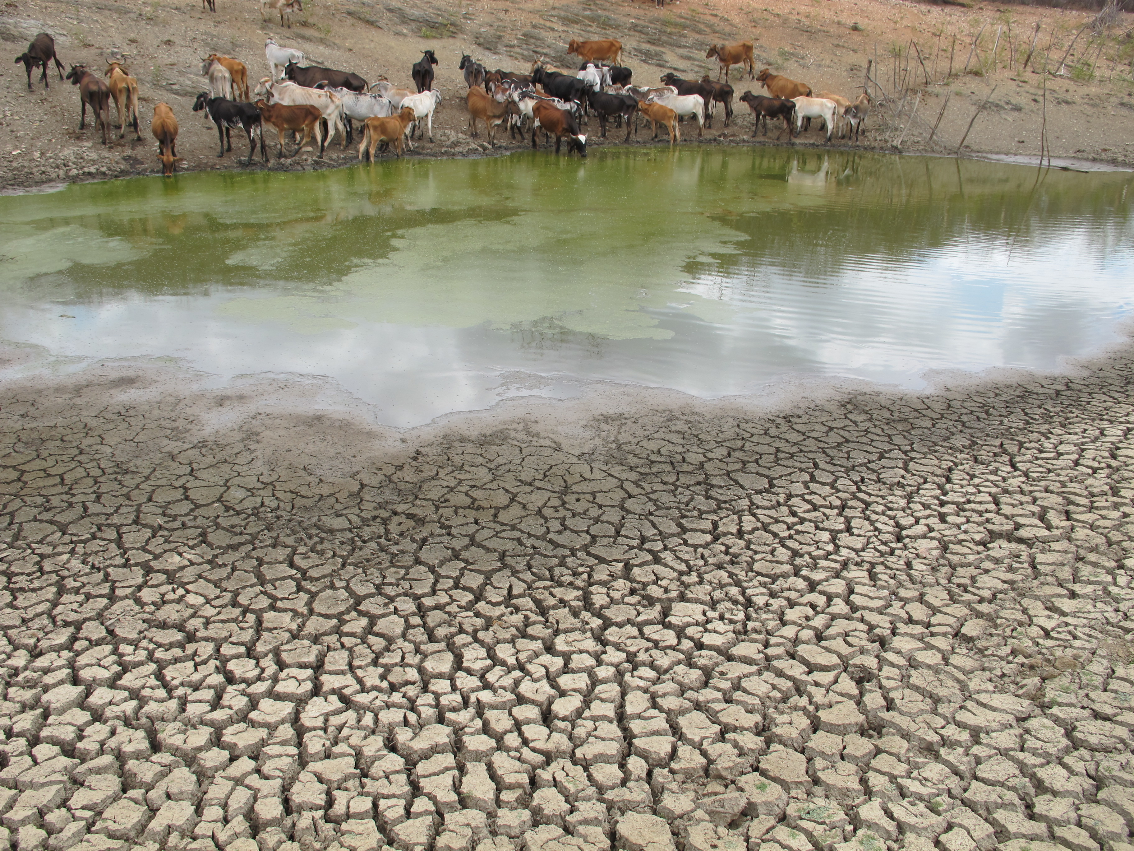 With no rain, watering holes for cattle throughout the area have also run dry. One of the few that still has water is at less than ten per cent capacity. It contains little oxygen, is filled with moss and mud, and the cattle can barely drink it.