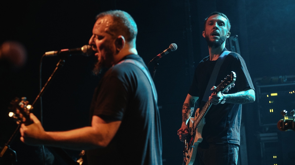A tall, thin man in a Soviet beret, guitarist Nikos stands on the edge of the stage. The vocalist, Sotiris, lowers his head and looks downward between guttural screams.