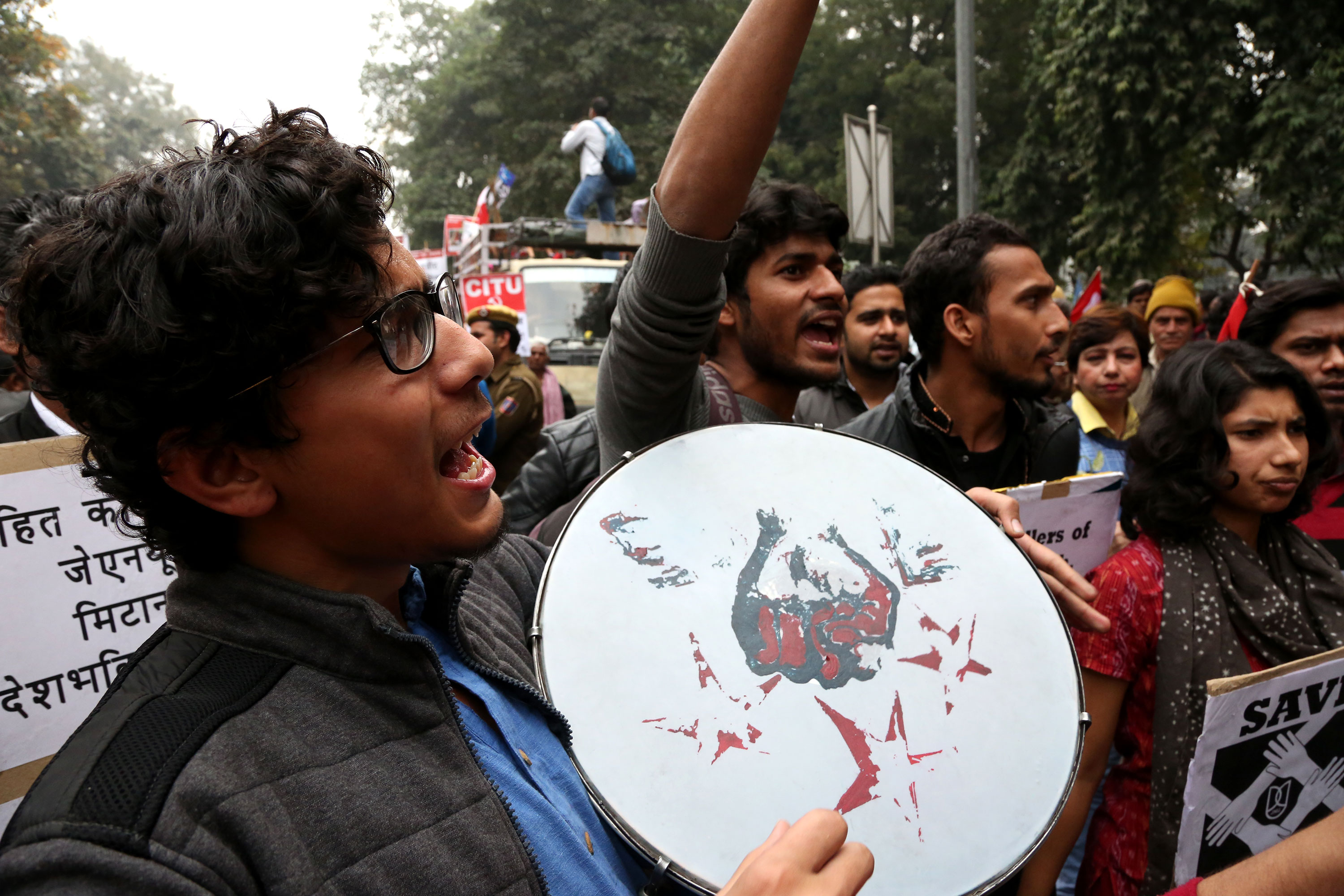 “I am here to defend democracy and resist the fascist forces that have been attacking our freedom of expression,” said Gopinath Ravindran, a professor at Jamia Millia University.