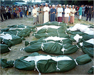 On 28 April, police and soldiers killed 107 Muslims who attacked police posts in a failed attempt to seize firearms. At least 32 were killed inside a 16th century mosque in a massacre that angered Muslims worldwide.