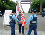 Even Taiwanese reporters who disembarked from the buses were stopped from approaching the shrine by the police, who said there was a possibility that the group’s presence could lead to violence.