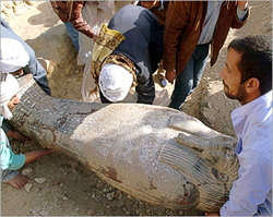 But it is not clear when or whether the statue will be completely unearthed. It is blocked by the remnants of an ancient structure, possibly a gate.