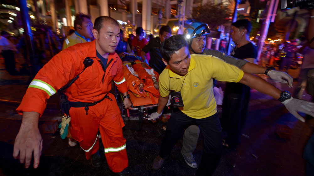 Rescue efforts continue after explosion at central Bangkok shrine kills at least 20 people and wounds another 78.