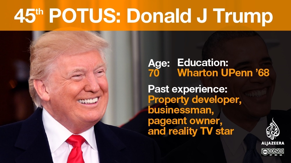 Trump, a 70-year old businessman, has no previous political experience. He is a former reality TV star whose campaign dominated headlines with his shocking comments on minorities, women and rival politicians.