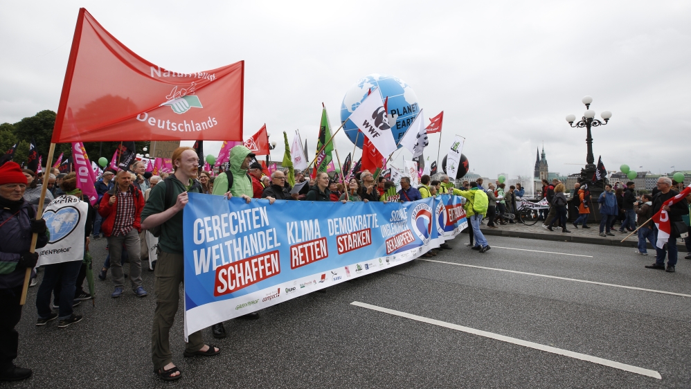 Sunday’s demonstration in the northern German city was organised by environmental, labour, human rights and church groups protesting against the policies of the world’s richest countries.