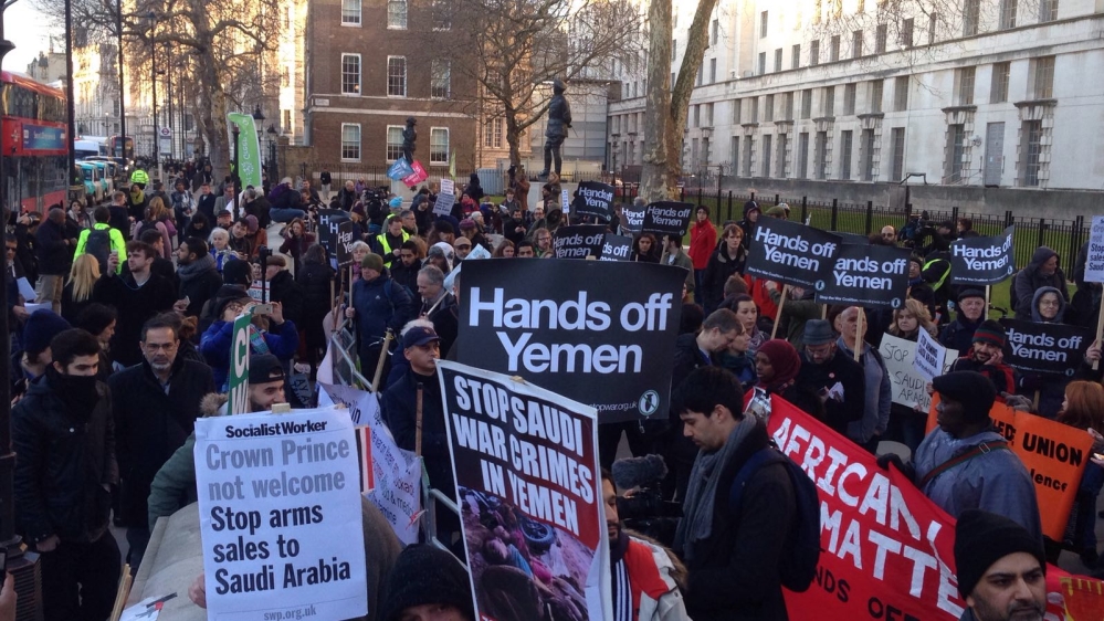 Robin McGhee, 26, told Al Jazeera he came to the protest because “British government support for Saudi [Arabia] is an exceptionally bad act in the history of British foreign policy and I’m frankly just embarrassed that my country is doing something as unethical as actively helping the Saudi government in its devastating war in Yemen”.