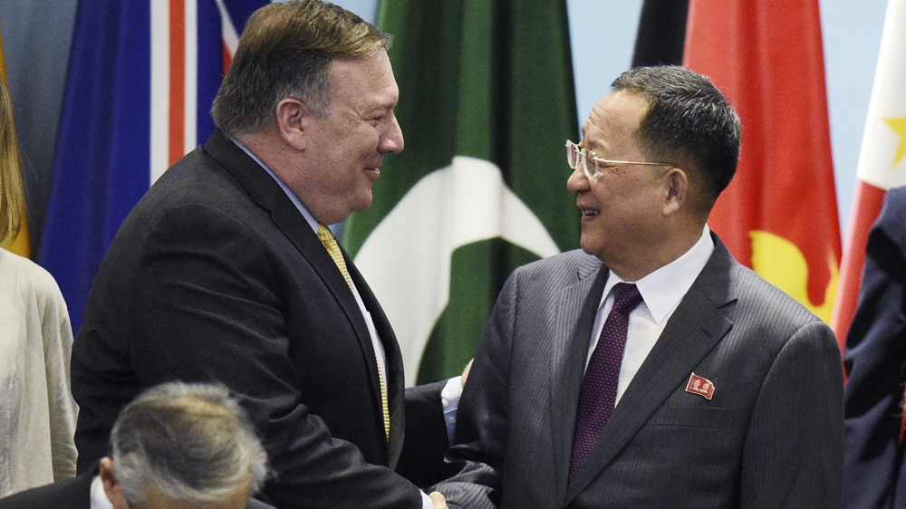 On Saturday, Pompeo briefly met North Korea’s foreign minister, greeting him at a joint photo of ministers, with the pair shaking hands, smiling and exchanging some words.