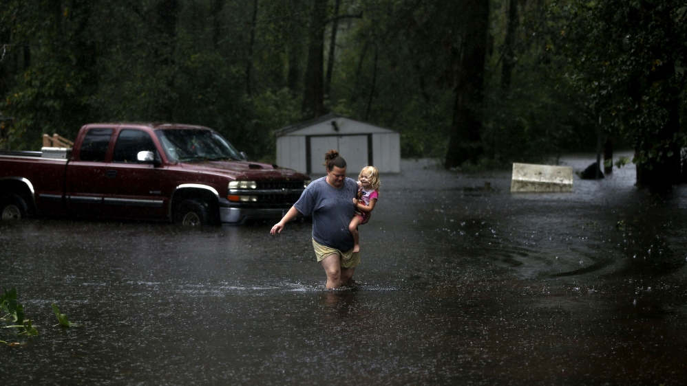 By 4:50pm (20:50GMT) on Friday, NHC had downgraded the hurricane to a tropical storm, but Florence’s movement had slowed to a crawl, piling on the rain in a siege that could go on all weekend long.
