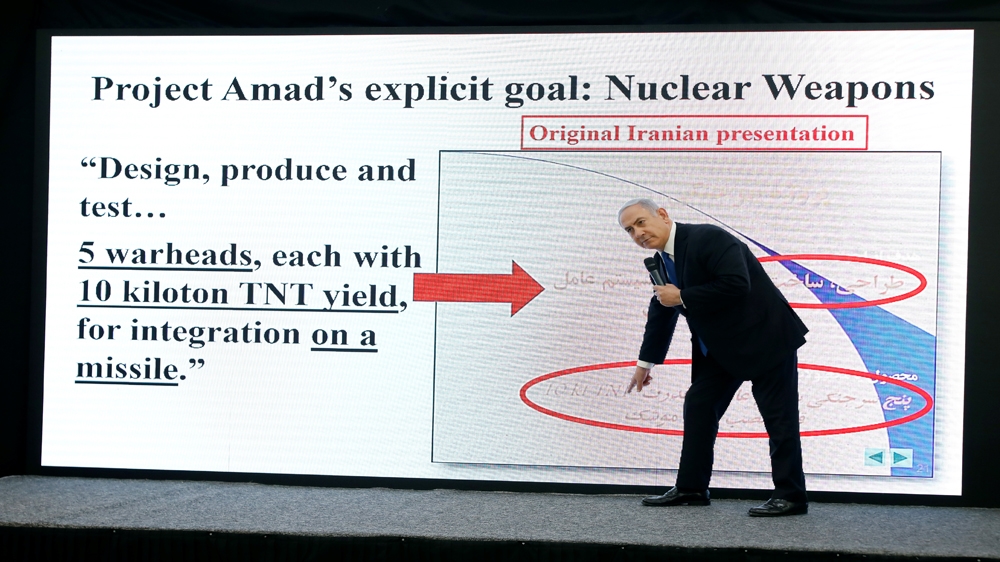 Netanyahu gives theatrical presentation claiming to show ‘conclusive evidence’ Iran pursued a secret nuclear programme.