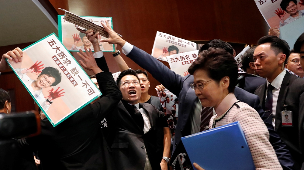 Hong Kong, China – Hong Kong’s Chief Executive Carrie Lam was forced to abandon her annual policy address to the semi-autonomous city’s Legislative Council (LegCo) moments after she began to speak, amid heckling from a group of pro-democracy politicians that forced the entire session to be adjourned.