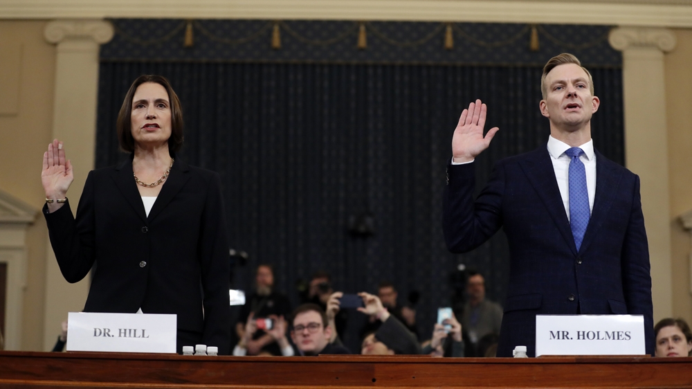 Fiona Hill, the former senior director for Russia and Europe at the White House National Security Council, and David Holmes, the top political counsellor at the US embassy in Kyiv, testified on the fifth day of public hearings in the impeachment inquiry.