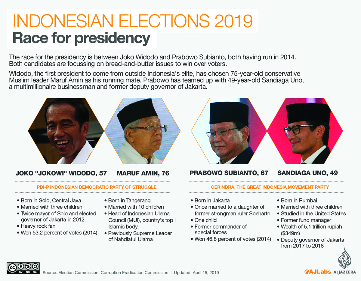 The presidential race pits incumbent Joko “Jokowi” Widodo and his running mate, Indonesian Ulama Council Chairman Ma’ruf Amin, against retired general and longtime rival Prabowo Subianto and multi-millionaire businessman Sandiaga Uno.