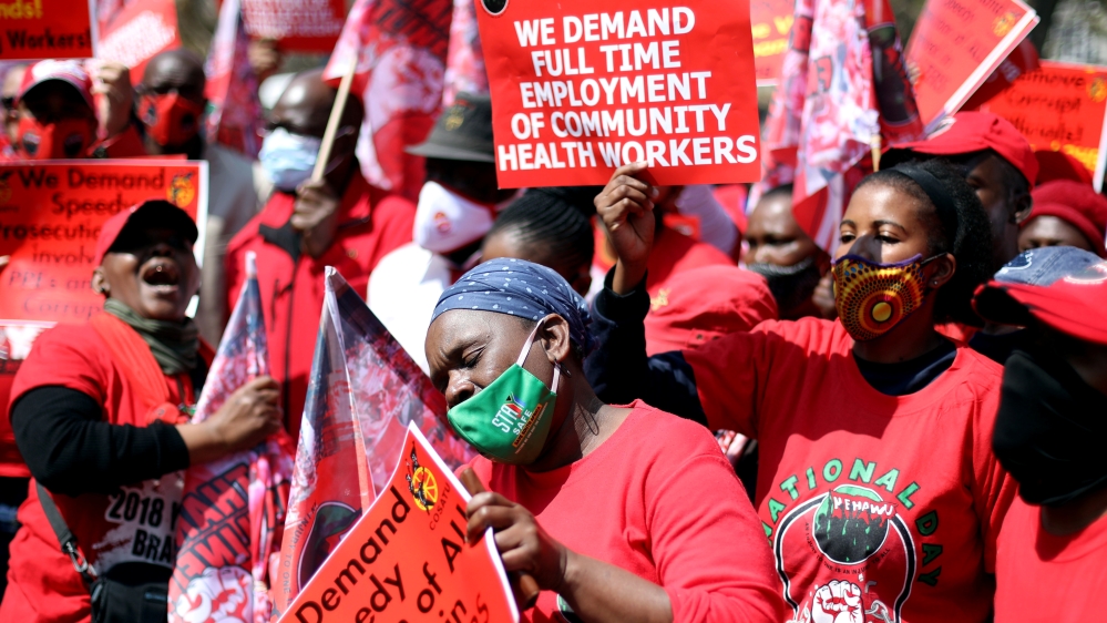 South African healthcare workers have protested against poor working conditions and urged the government to end corruption in the procurement of coronavirus personal protective equipment.