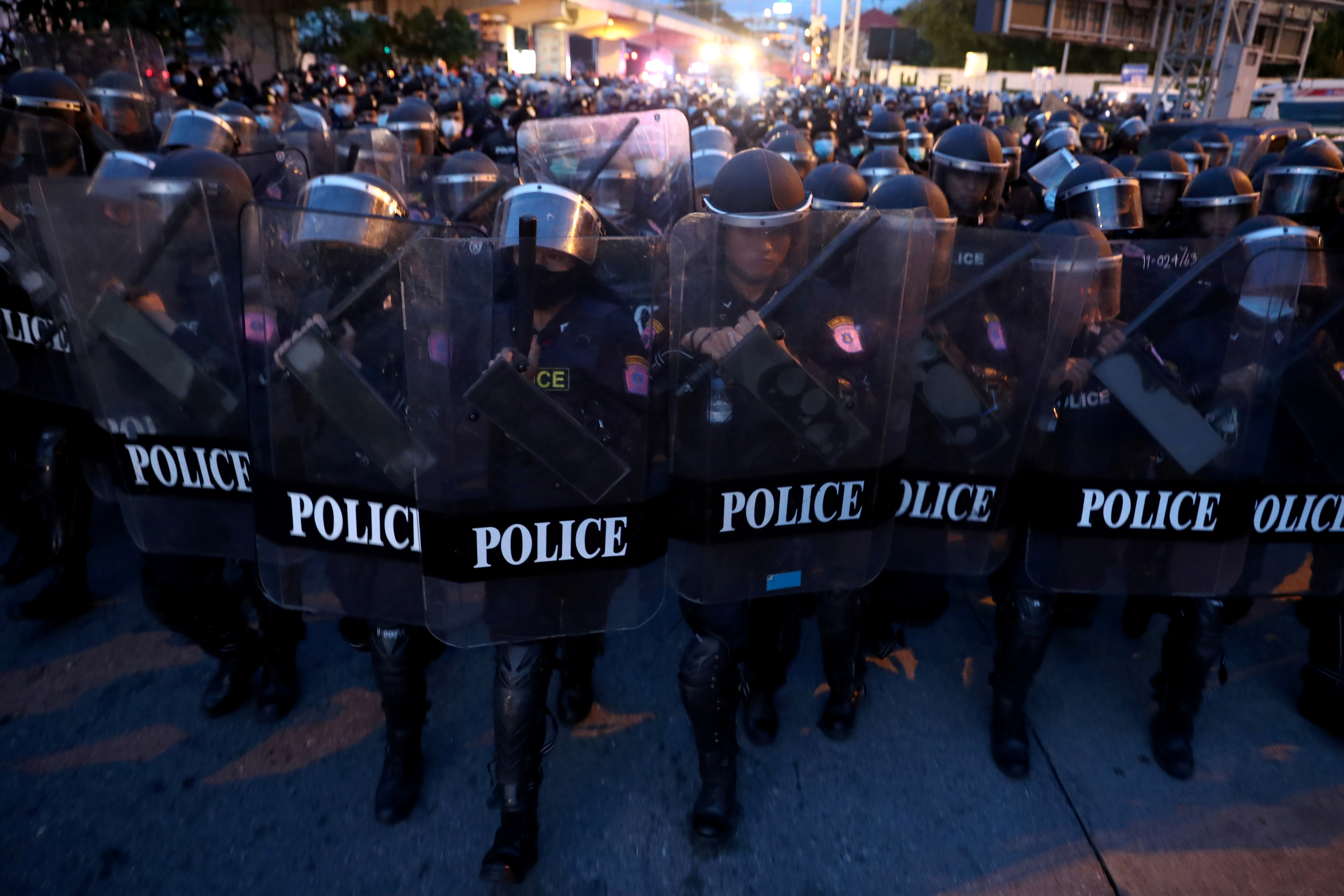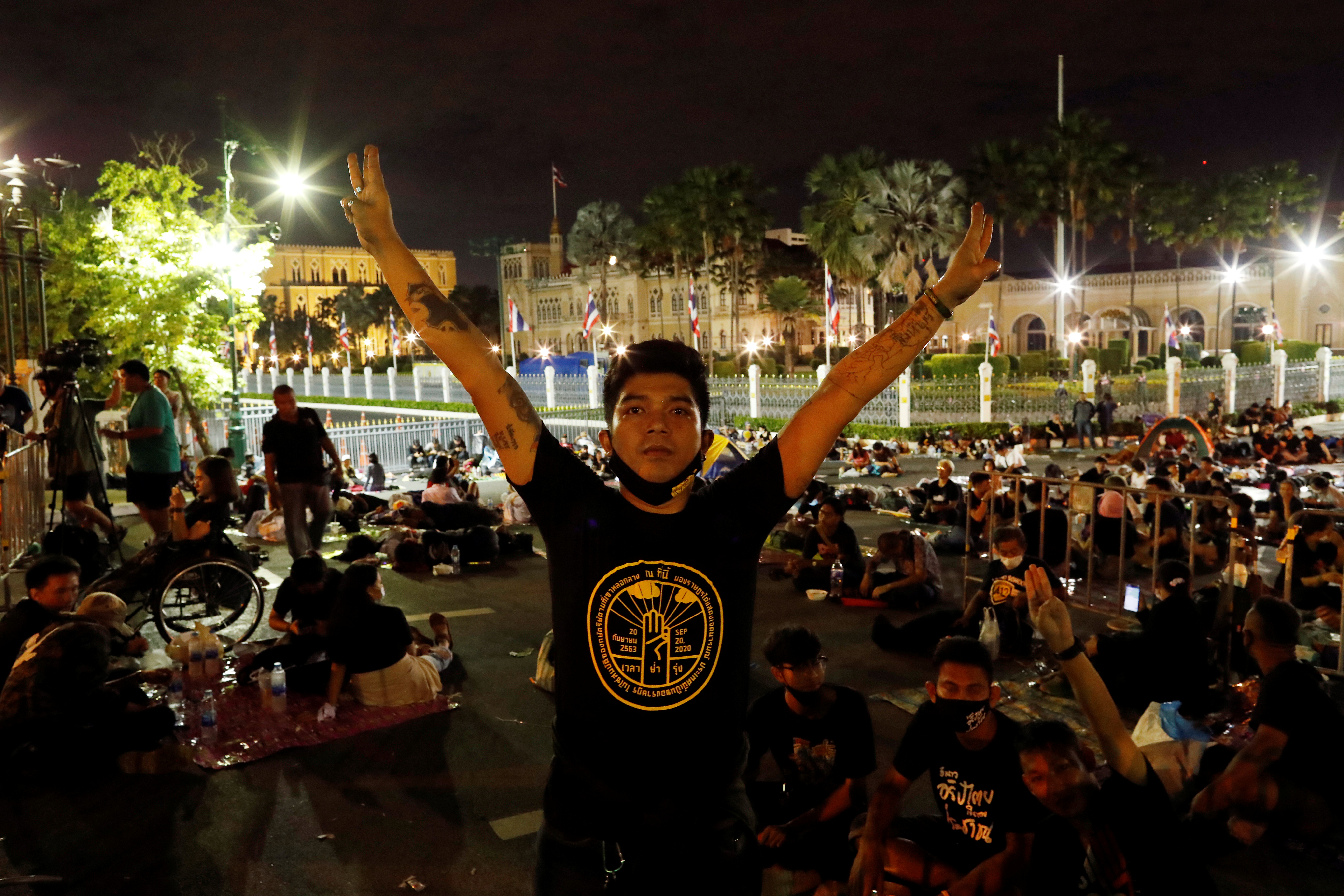 Shortly afterwards, police cleared the remaining protesters from outside Government House. Police said they had arrested protest leaders Parit “Penguin” Chirawat and rights lawyer Arnon Nampa. Thai Lawyers for Human Rights said its earlier statement that Panupong Jadnok had also been arrested was incorrect.