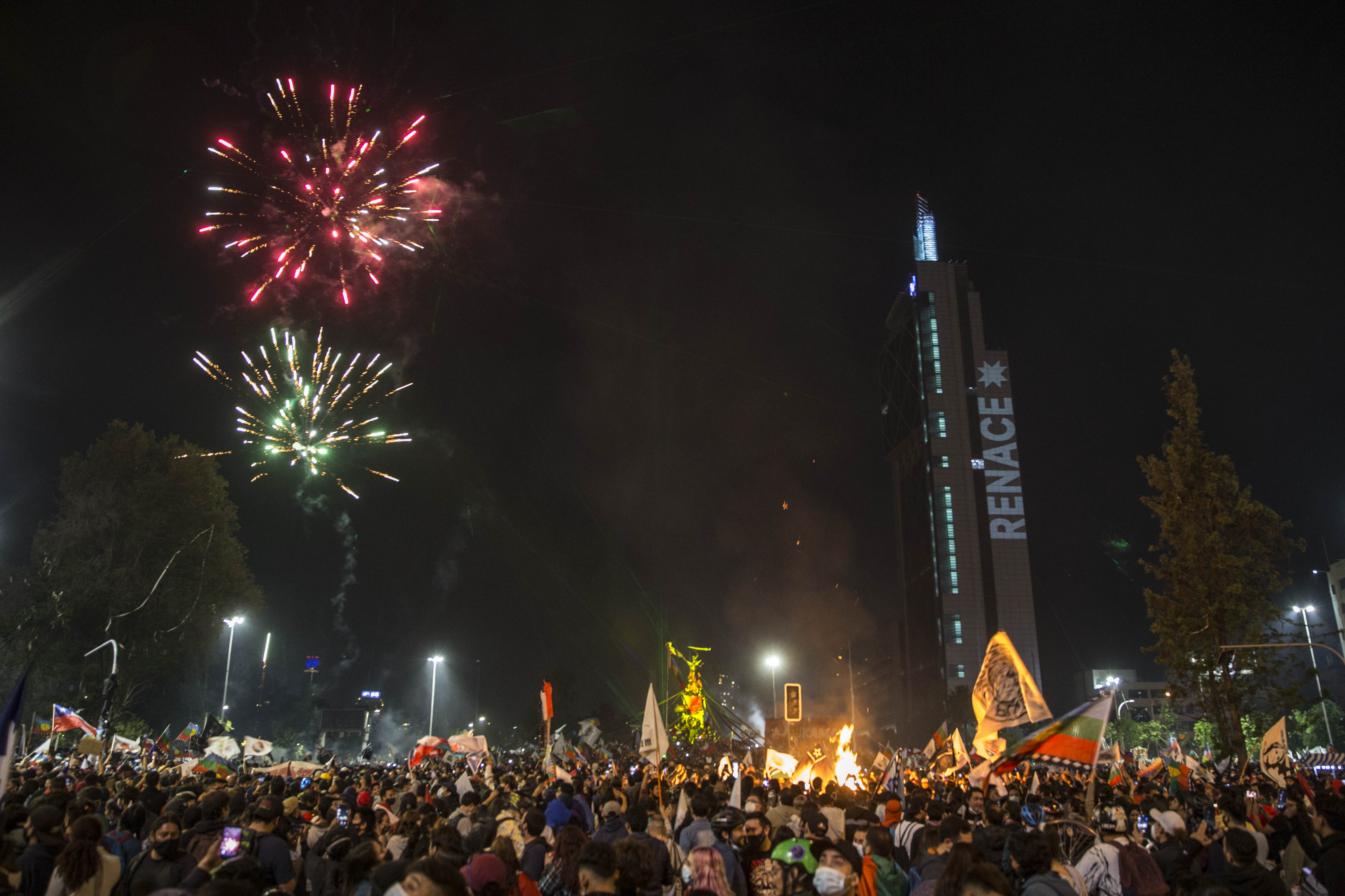 In Santiago’s Plaza Italia, the focus of the massive and often violent protests last year which sparked the demand for a new charter, fireworks rose above huge crowds of jubilant people singing in unison late on Sunday as the word “rebirth” was beamed onto a tower above.