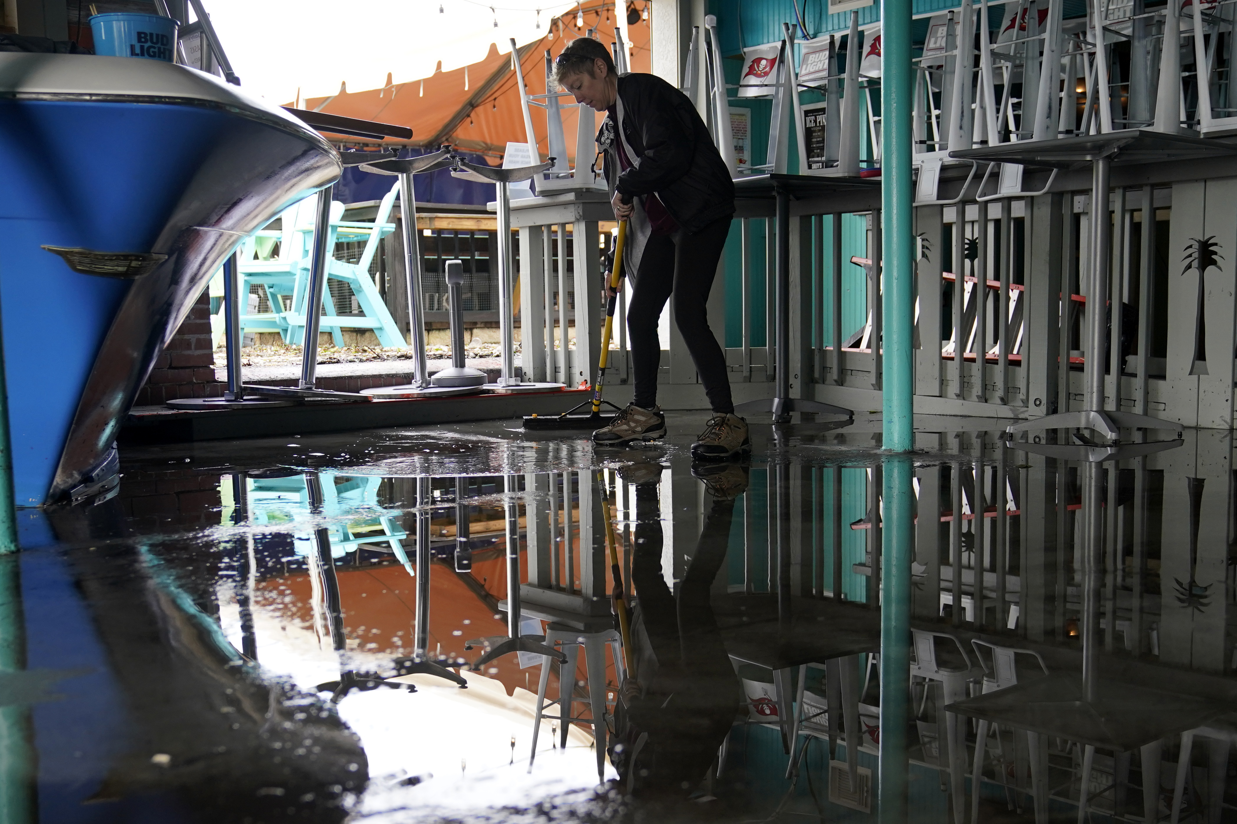 “It was pretty bad last night when I came in,” adding that there were already three to four inches (77mm-100mm) of water inside by just before high tide. “We’re in here doing our cleanup today and assessing the damage. I think we fared pretty well considering as bad as it looked last night.”