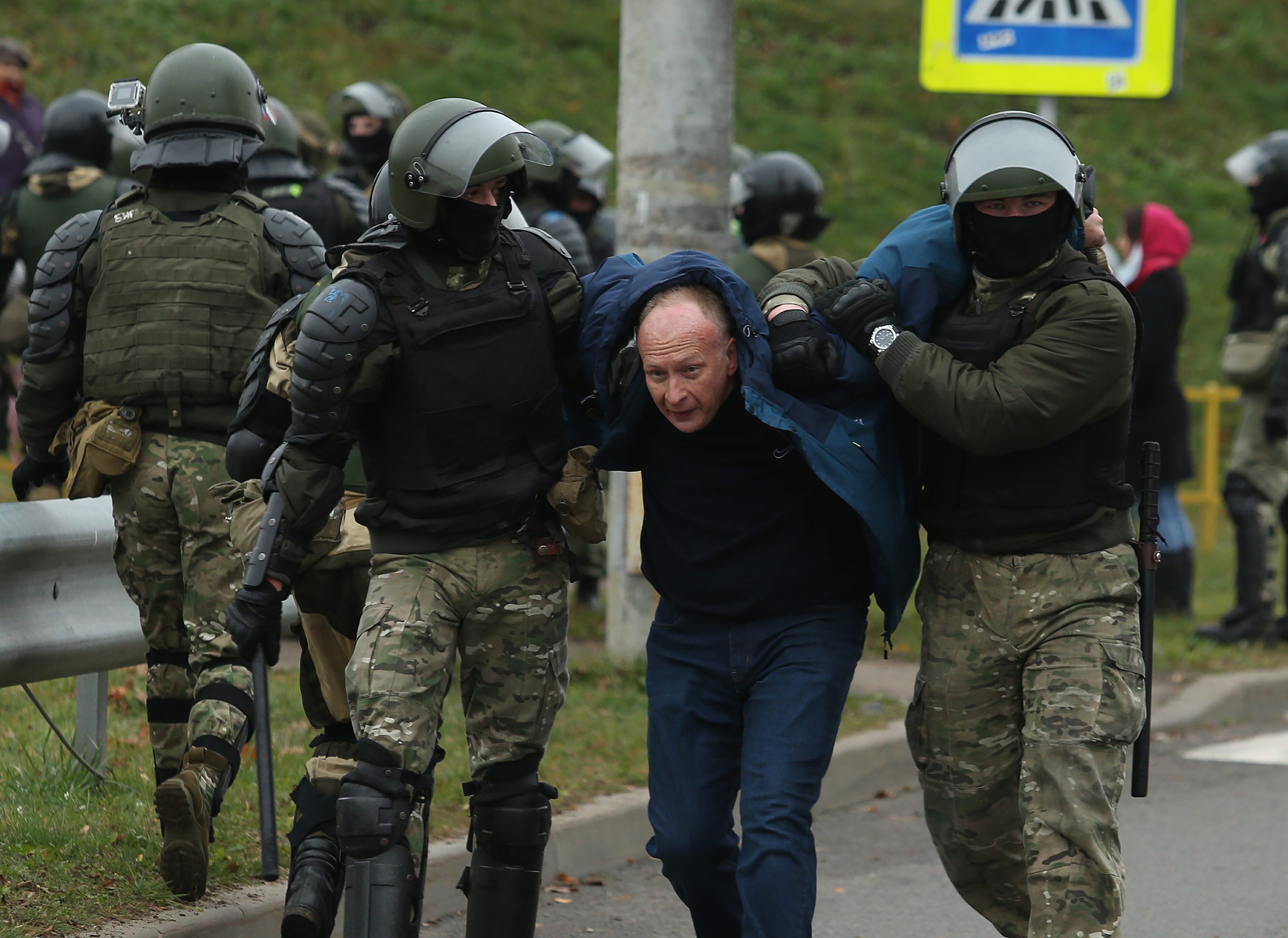 Security forces in riot gear and shields on Sunday flooded the square where Bondarenko was arrested, pulling down opposition flags, kicking over memorial lamps and dragging people from the crowds and frog-marching them to vans, a witness said.