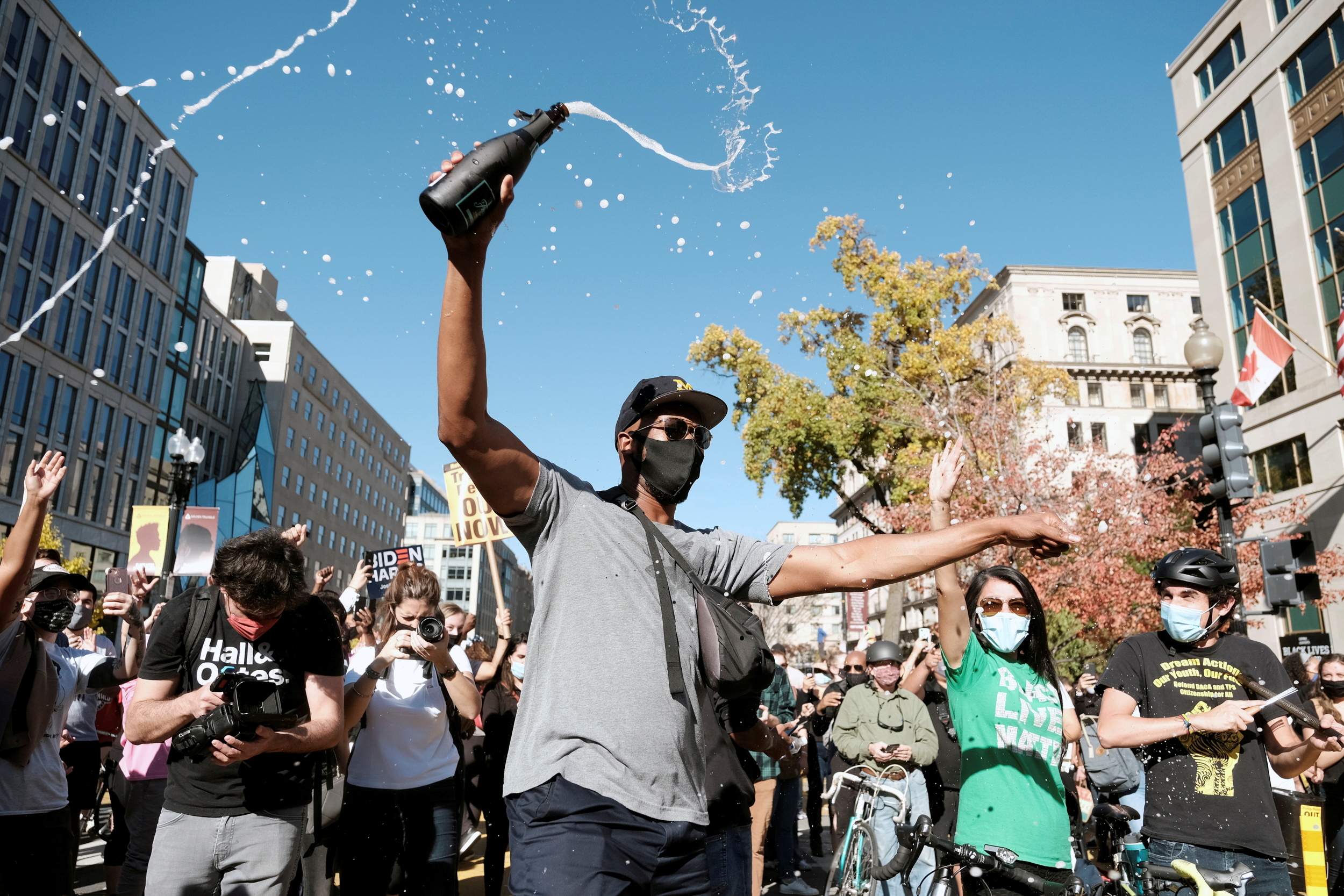 With Donald Trump in the nearby White House, thousands gather in Washington, DC streets to celebrate Joe Biden’s presidential win.