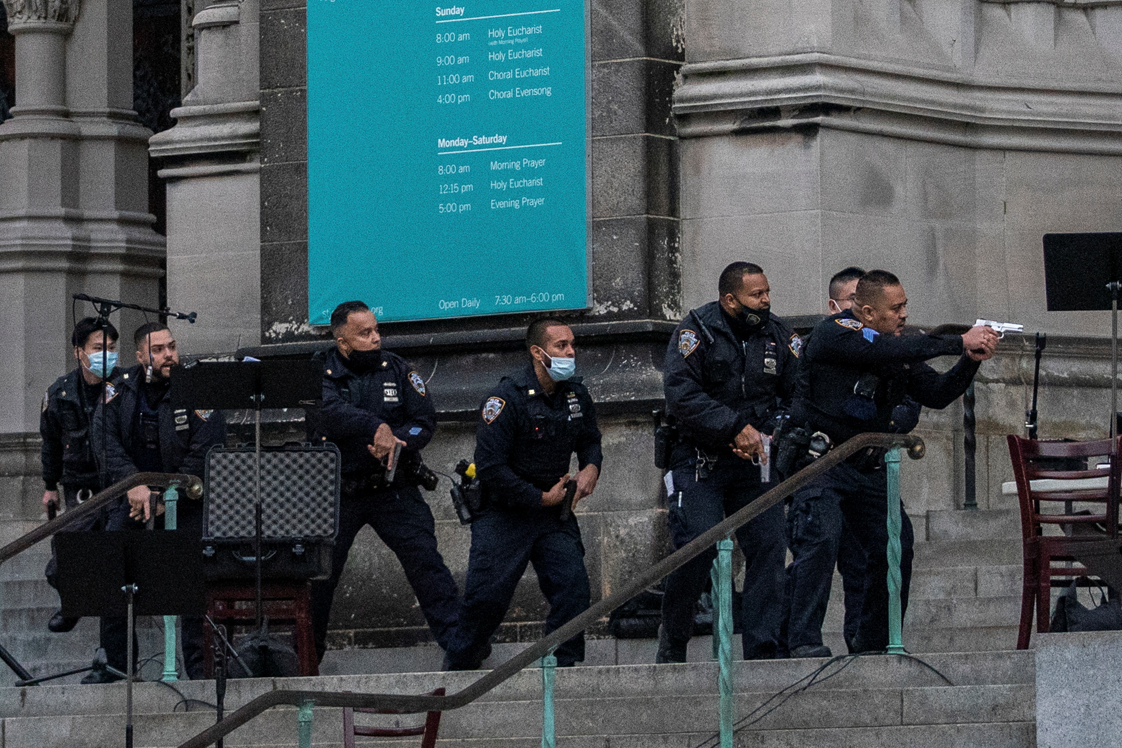 The gunfire began just before 4pm ET (21:00 GMT) at the Cathedral of Saint John the Divine, mother church of the Episcopal Diocese of New York.