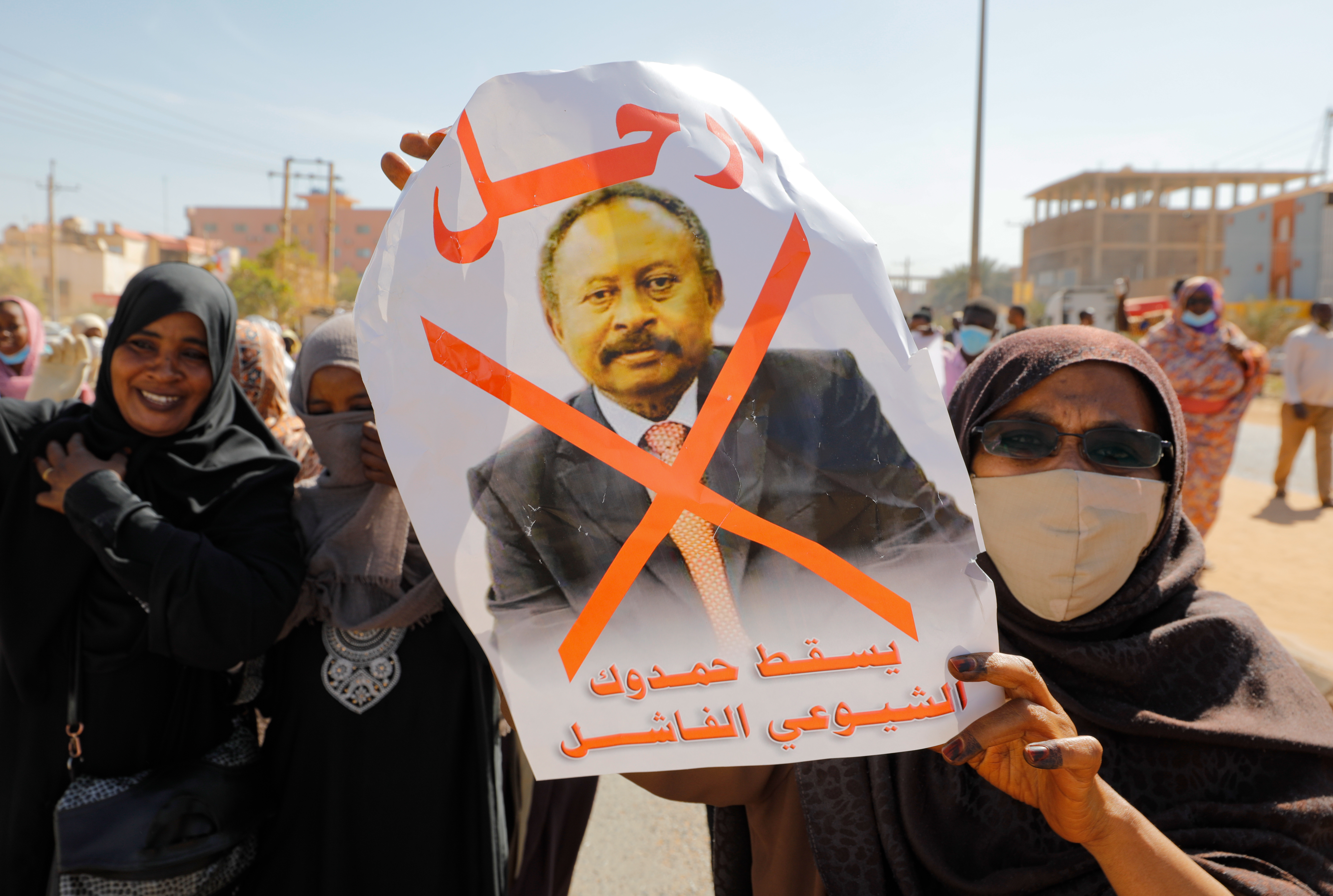Protesters at Khartoum’s airport held up printed posters of Prime Minister Abdalla Hamdok, his image scored out with the words: “Go away!”