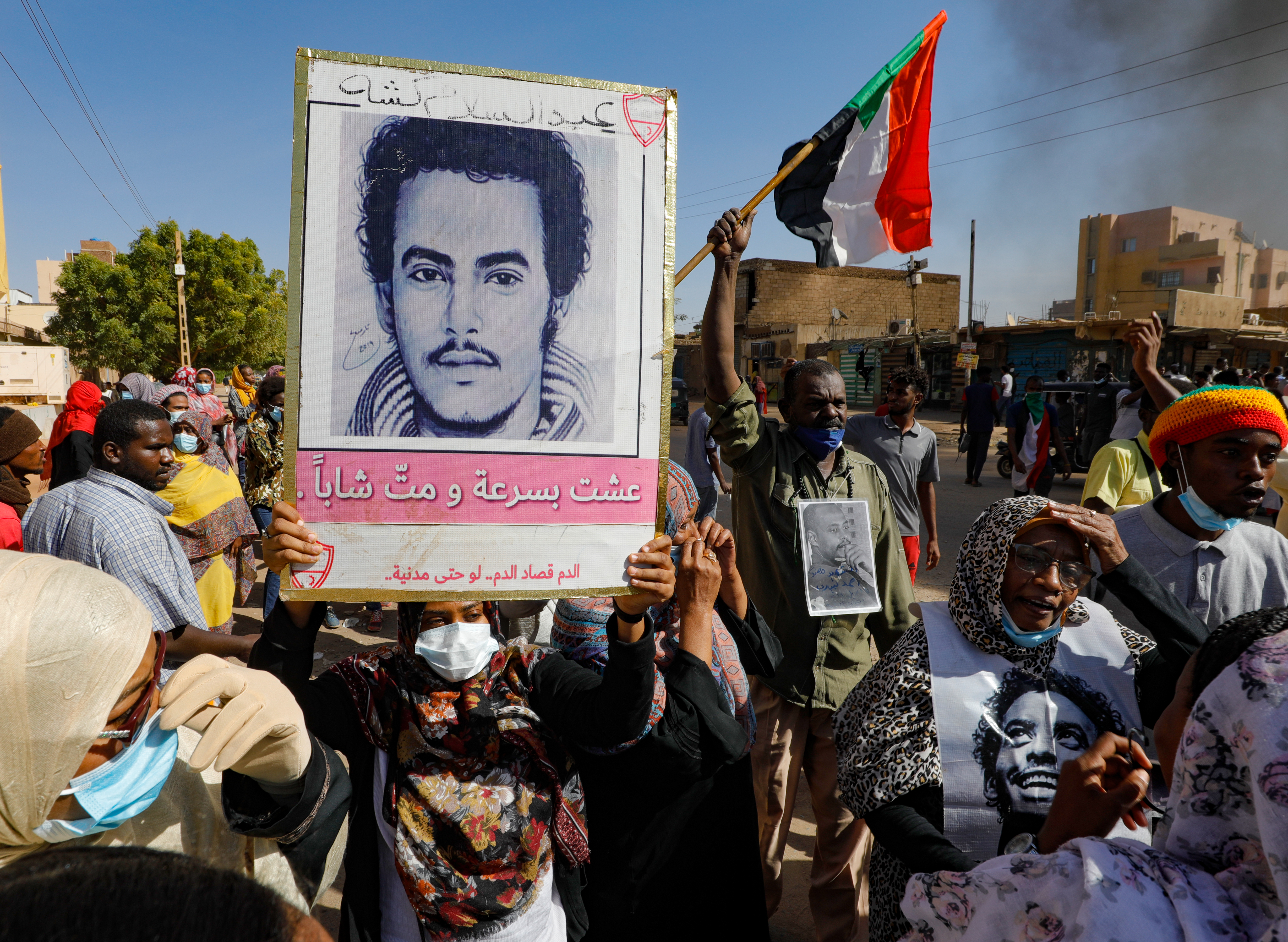 Black plumes of smoke billowed into the sky from burning tyres in the capital Khartoum’s southern Al-Sahafa district, with protesters marching to the gates of the presidential palace chanting “justice”.