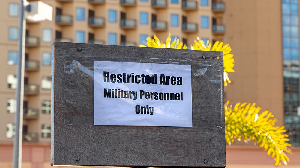 A sign at the Guam Reef Hotel in Tumon Bay warns civilians not to enter certain quarantined areas since at least 1,000 sailors from the aircraft carrier USS Theodore Roosevelt are housed at area hotels [Tony Azios/AFP]